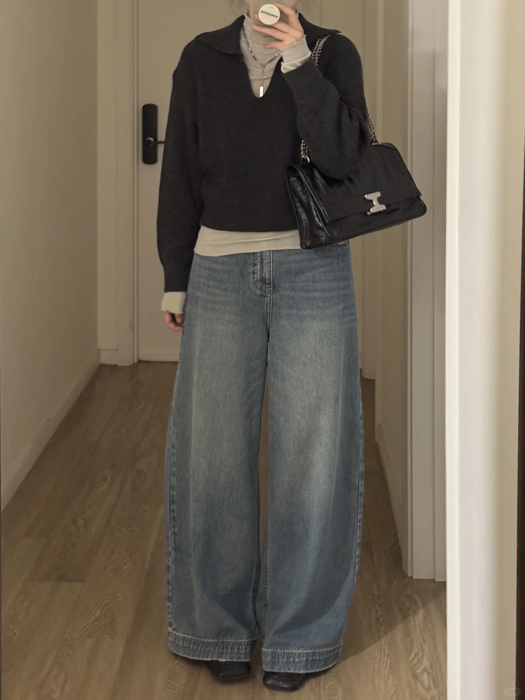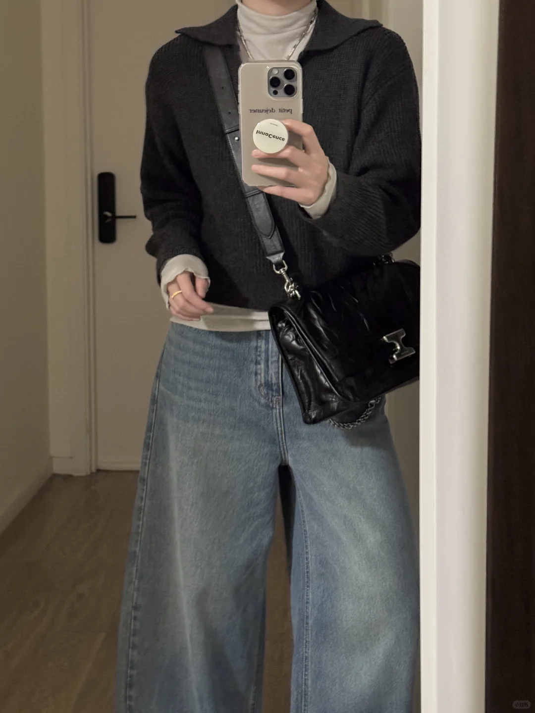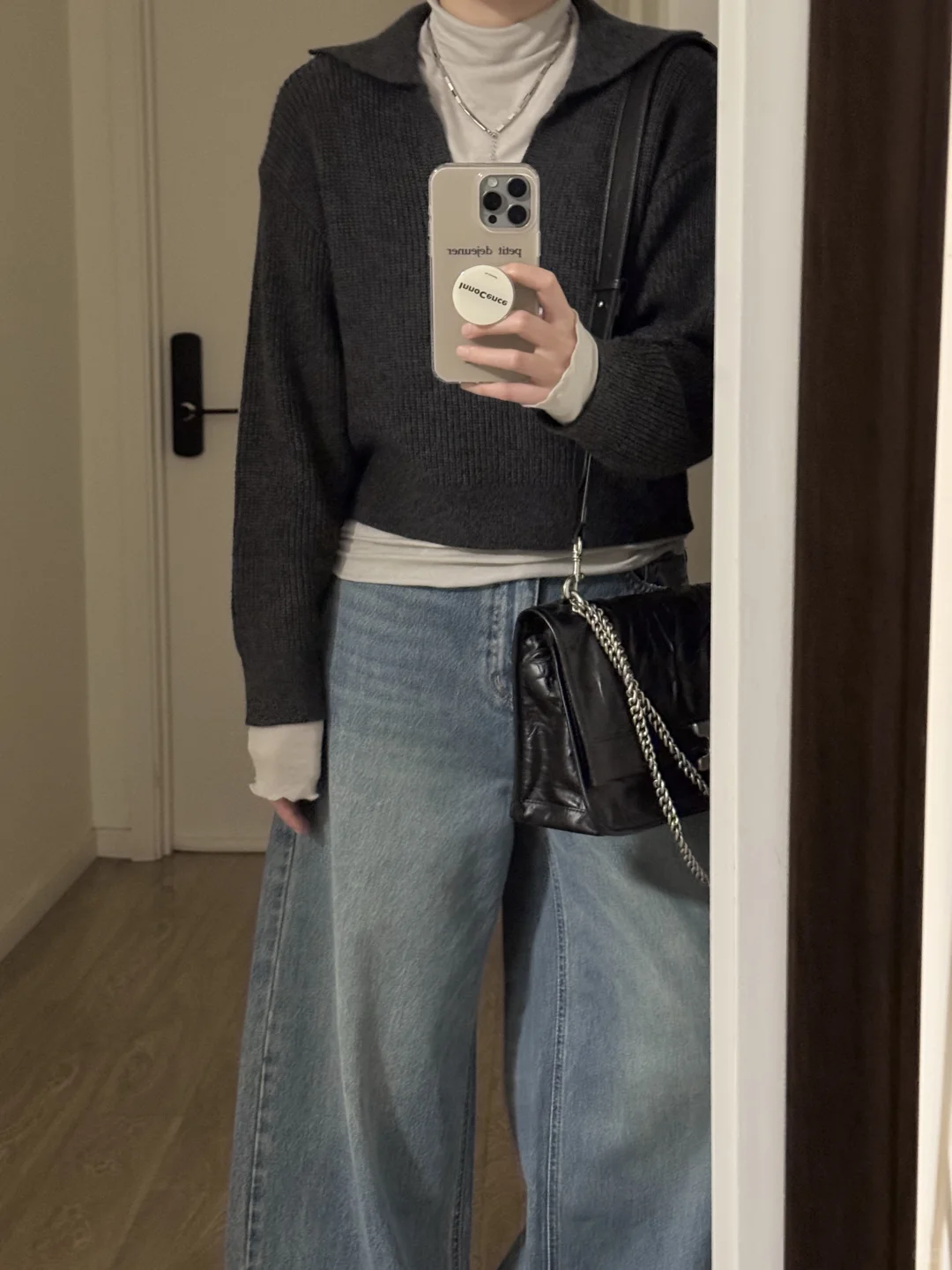 好秋冬韩系简约通勤灰毛衣蓝牛仔裤叠穿🎥