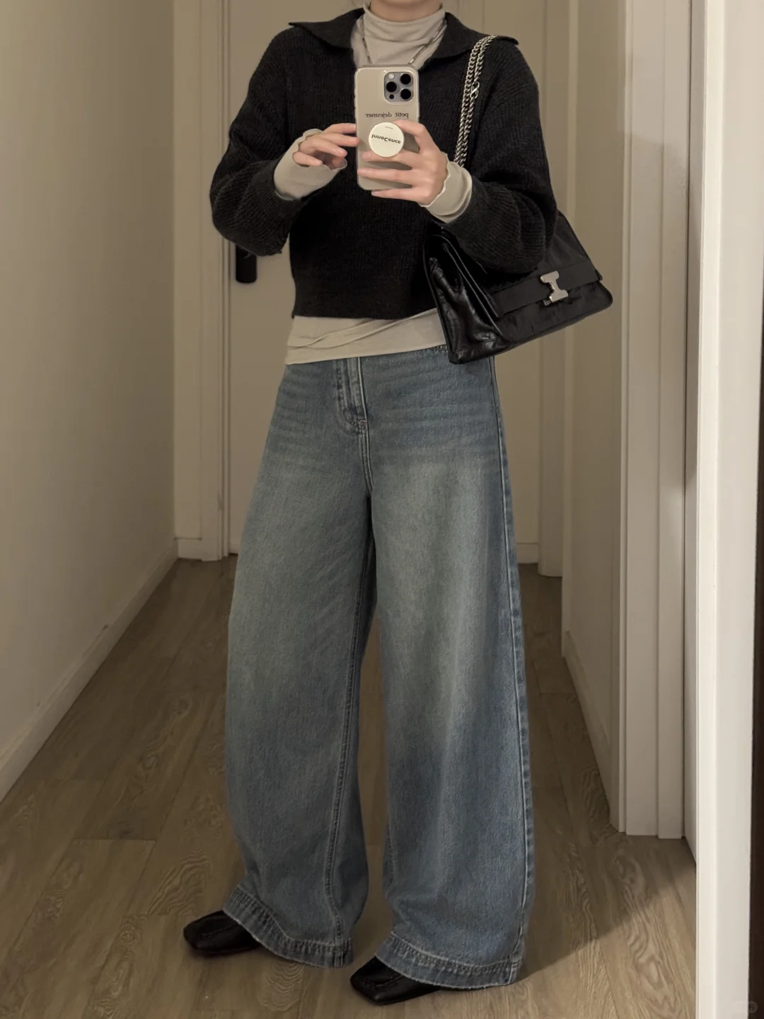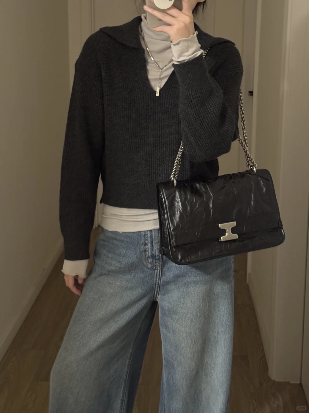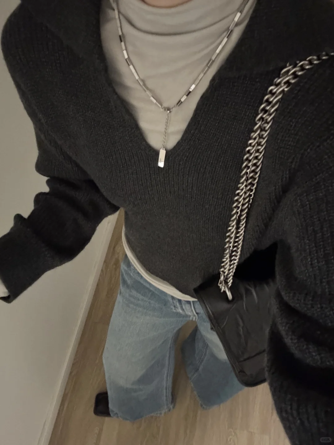 好秋冬韩系简约通勤灰毛衣蓝牛仔裤叠穿🎥
