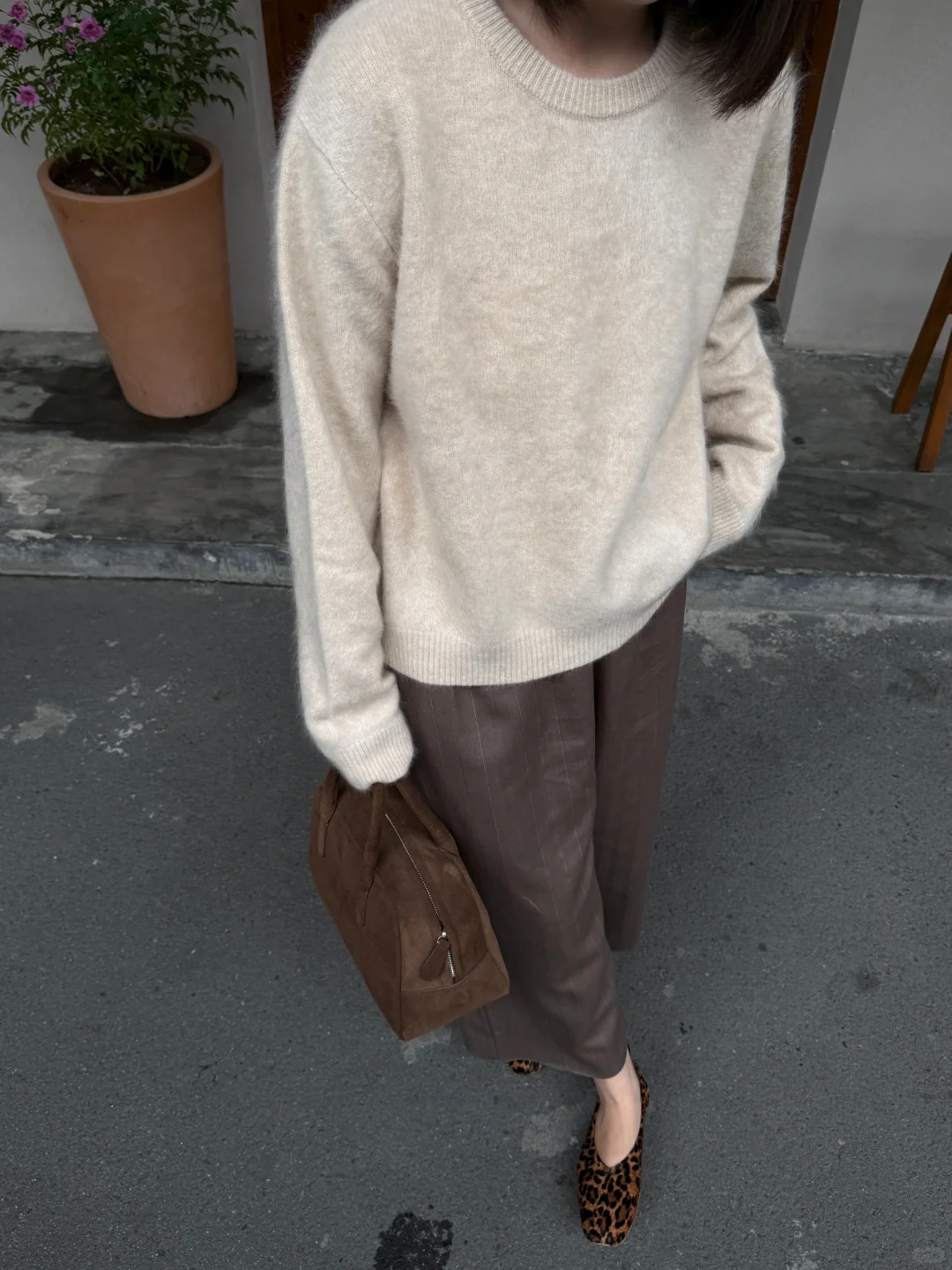 一位长相漂亮、身材出众的姑娘,穿上了一件对身材要求极高的紧身款一字肩粉色针织衫搭