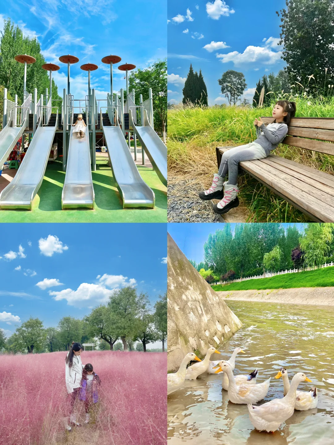 儿童乐园旁边紧挨皂河,河里有可爱小鸭子,还有绿意盎然的骑行道,景色非常美🖼