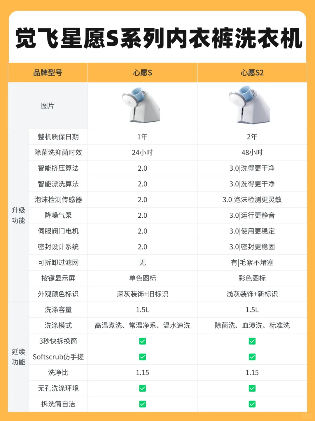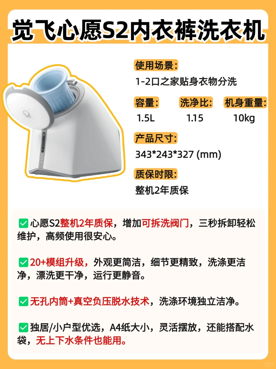 心愿S2是觉飞新升级的第三代内衣裤洗衣机,可以真正解决混洗和洗不净问题。这次的内外全面大升级,两年质保省心省事放心用。