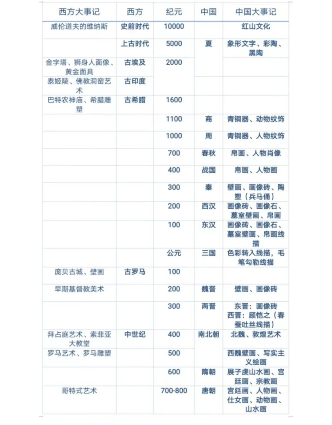 一直以来我们学美术史都是中美史外美史是割裂开分别学习的,实际上虽然东西方虽然地理上是相隔的,但由于经济往来、宗教传播,中外在艺术文化交流上一直互相影响着,所以对于同时期中西方的美术史的总结是极为重要的!并且各大高校都喜欢以此来考察论述分析题。