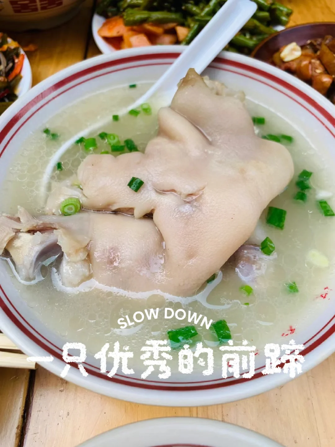 稀溜趴、软烂、雪白的猪蹄切成两半,轻轻一翻,便可看见肉骨相连的一丝粉嫩。数小时的炖煮,一筷子夺下去,耙噜噜的蹄花儿弹啊弹。