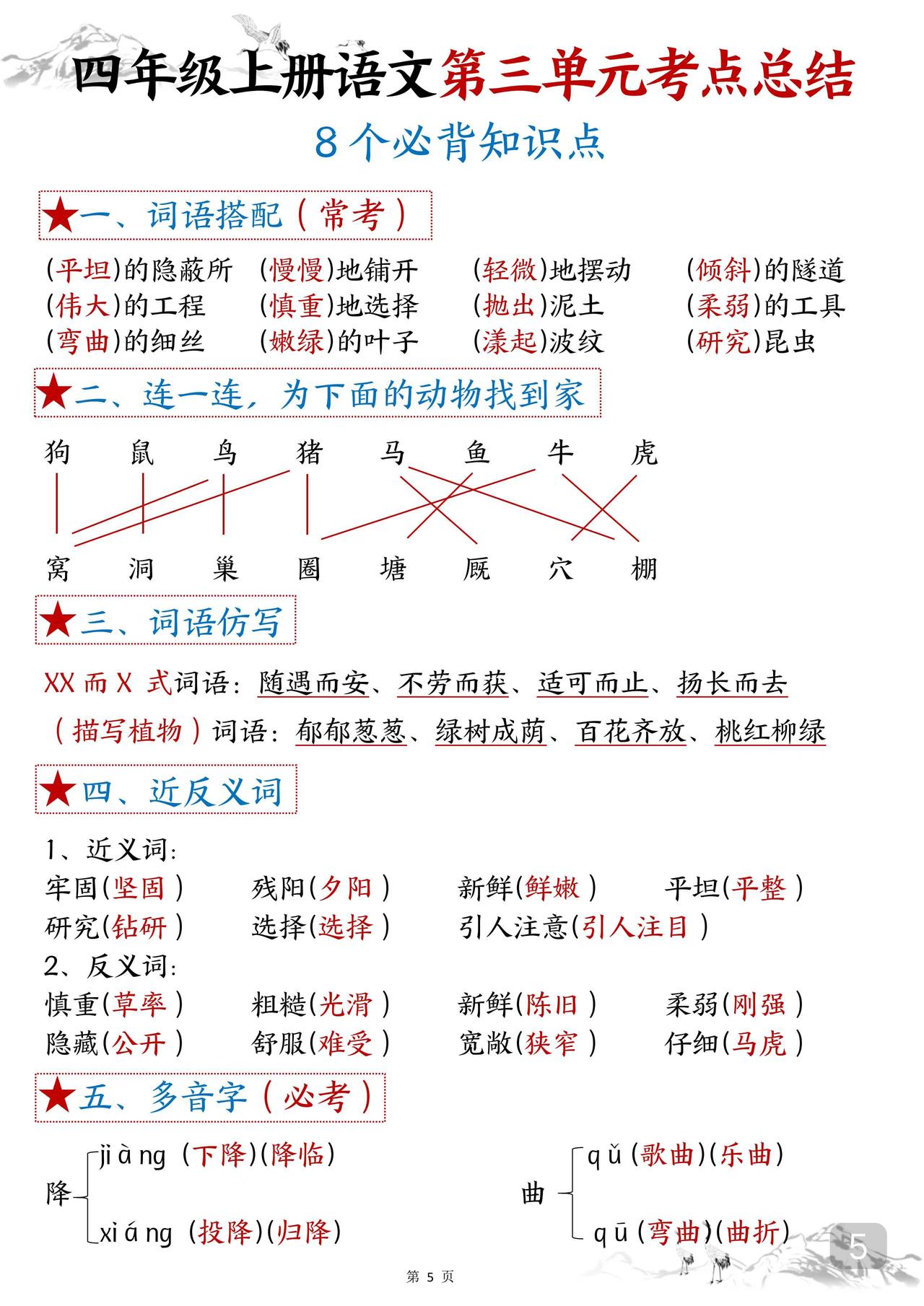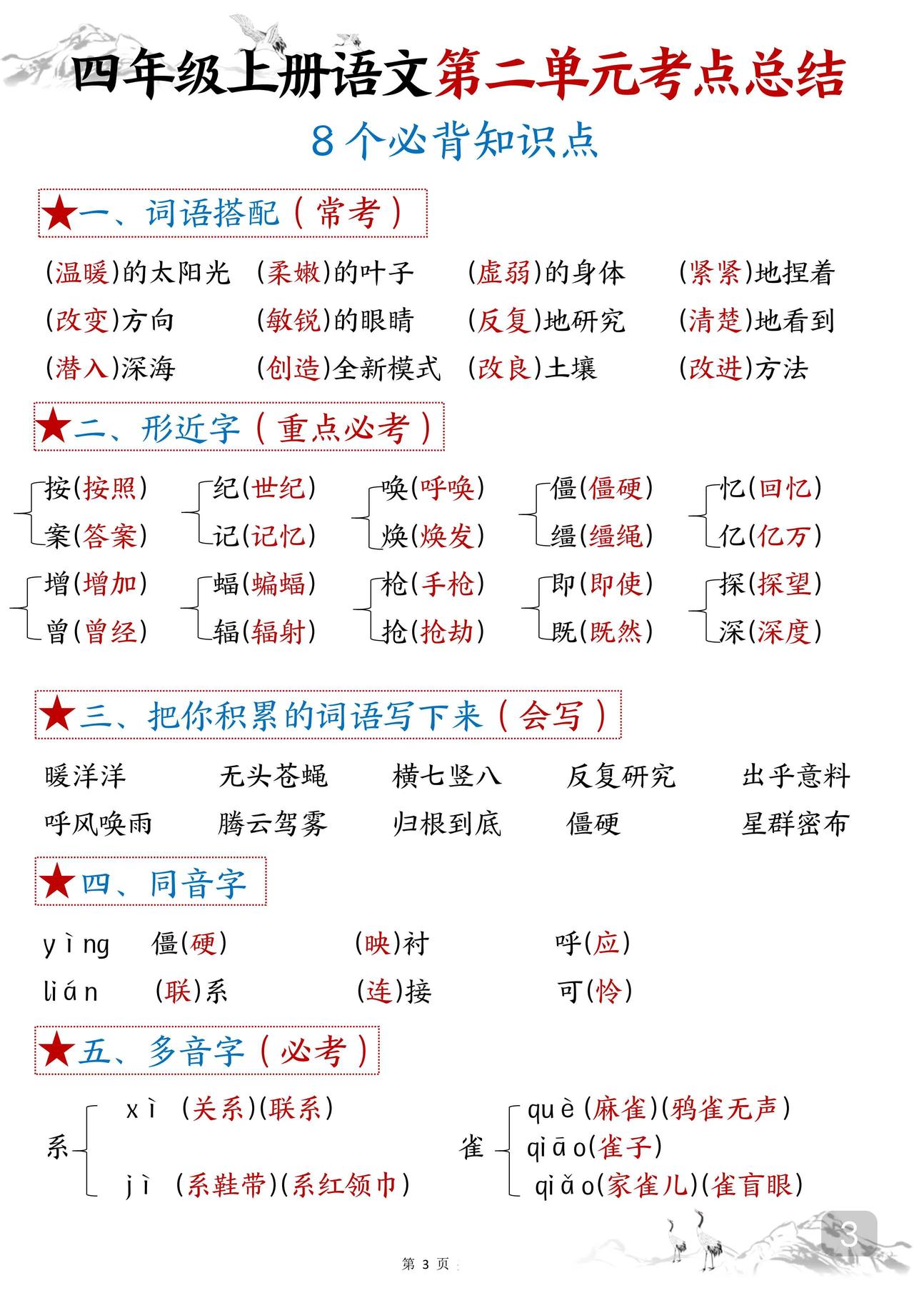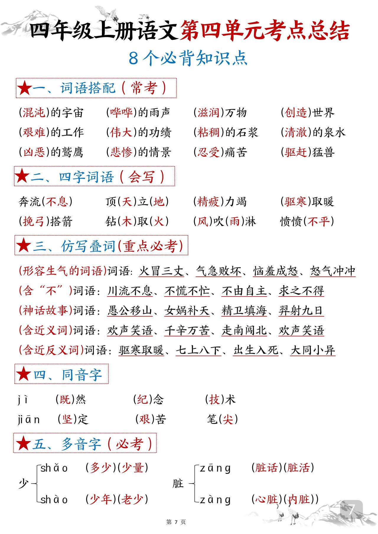 四年级上册语文1-4单元考点总结,有需要的点赞收藏