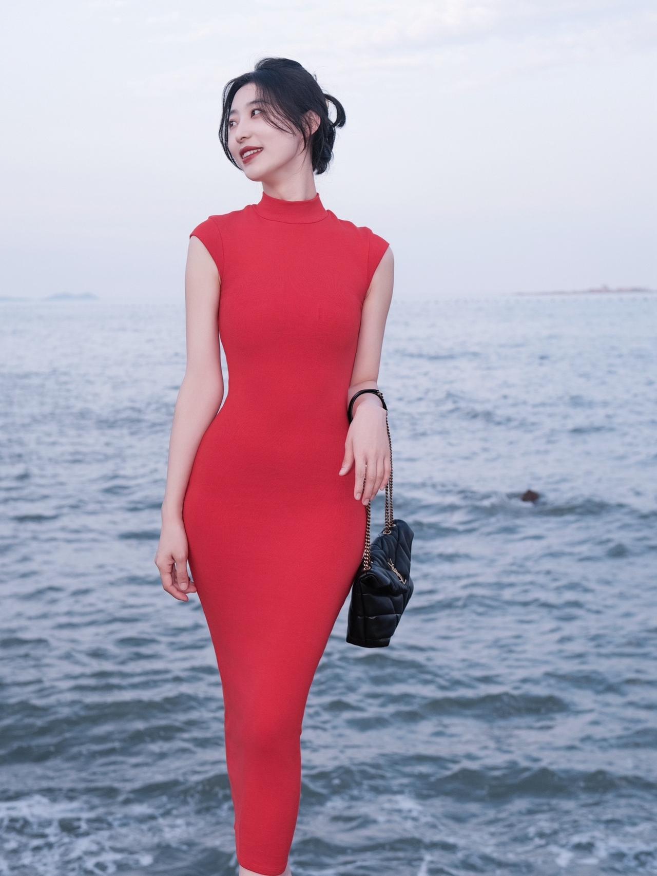 视觉中国拍的Lisa穿繁花紧身长裙照
