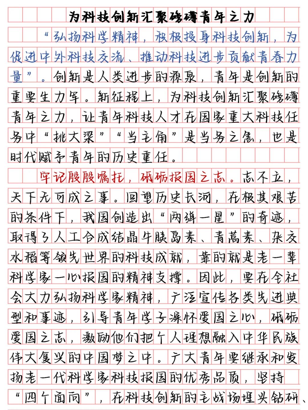 【适用主题】科技创新 【论点分析】 牢记殷殷嘱托,砥砺报国之志。 投身创新实践,绘好成长路径。 营造良好氛围,秉持坚韧决心。 【金句积累】 “弘扬科学精神,积极投身科技创新,为促进中外科技交流、推动科技进步贡献青春力量”。