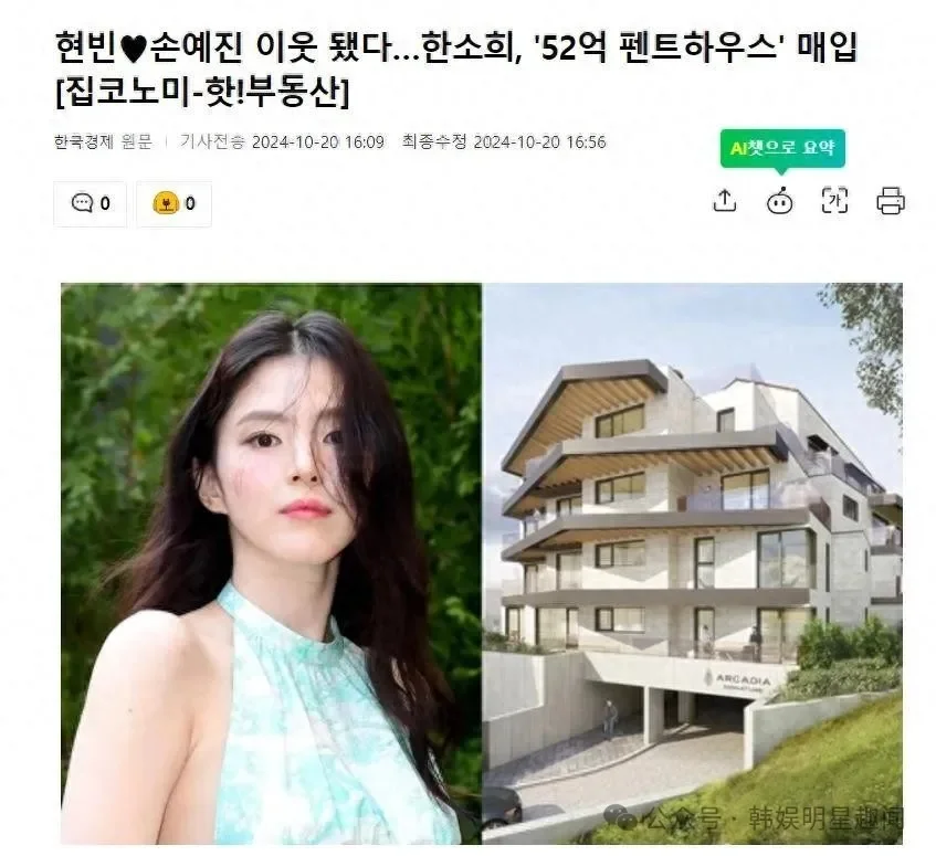 10月20日,有韩国媒体报道,韩国知名女星,演员韩素希,成为了位于京畿道艺术村的豪华顶层公寓的业主,和玄彬、孙艺珍成为邻居。