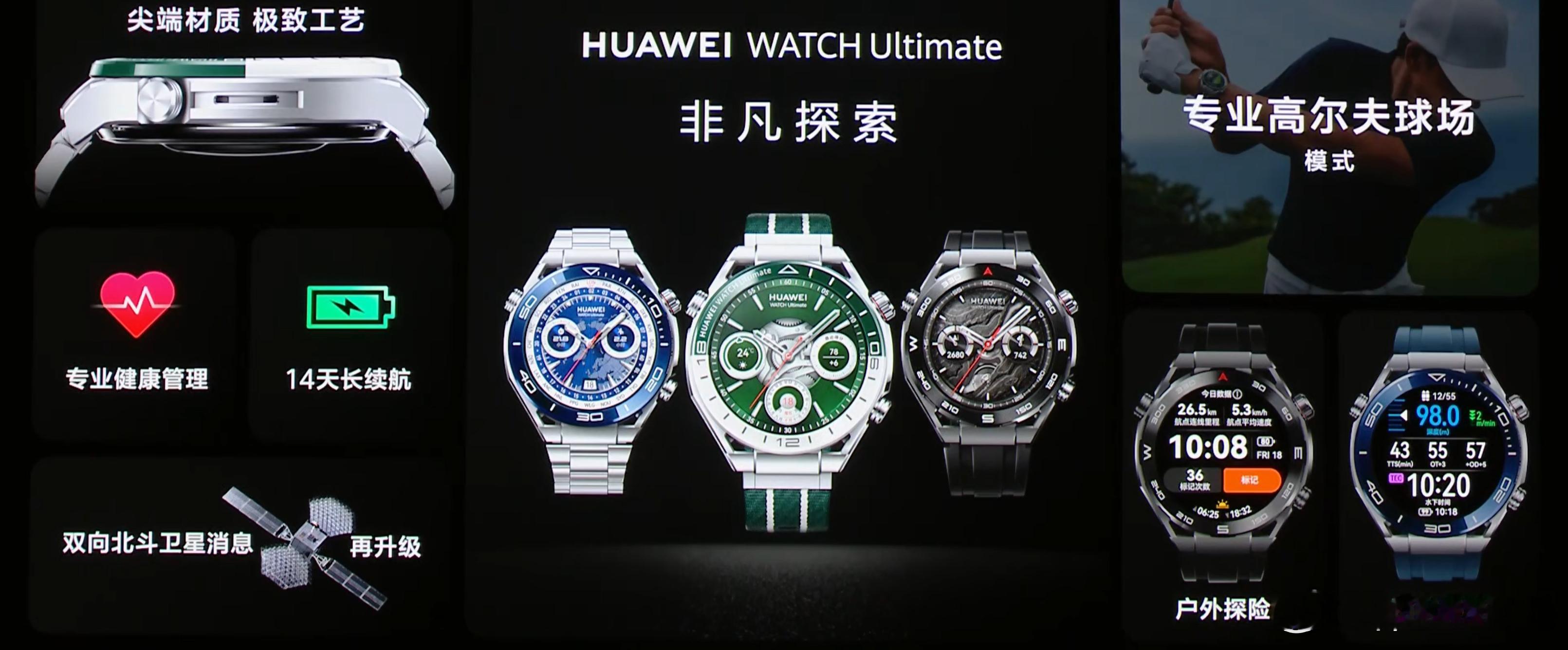 华为Ultimate系列为专业运动设计。这次搭载专业高尔夫球场模式,覆盖全球1.5万+球场地图,带来更专业更智能的高尔夫球场表现。另外也支持北斗双向卫星消息、领先级百米防水潜水性能。可以说代表了智能手表工艺设计与性能表现的新巅峰。