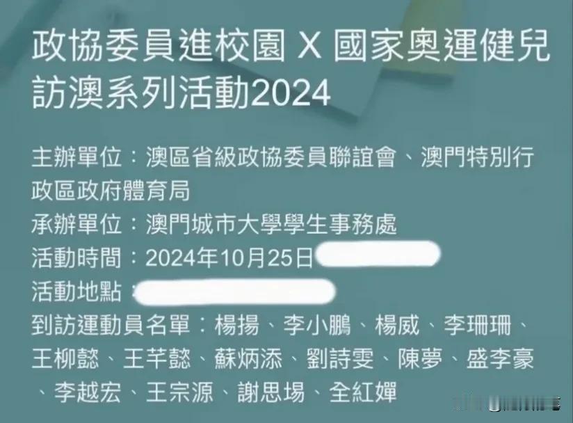 全红婵连续两场最新公开活动行程来了。除了之前公开确定将在26日和郭晶晶一起在澳门参加全民健身跑活动之外,目前又有最新消息称在25日,全红婵将和谢思埸、陈梦等奥运健儿出席澳门一个校园活动。不得不说,全红婵的活动真的多啊。#全红婵#