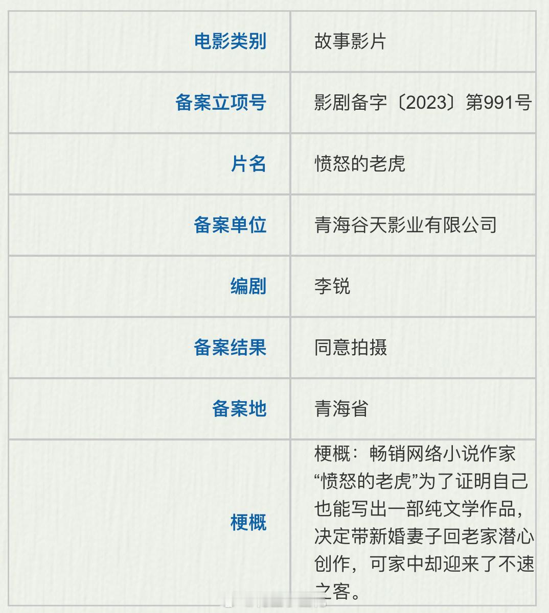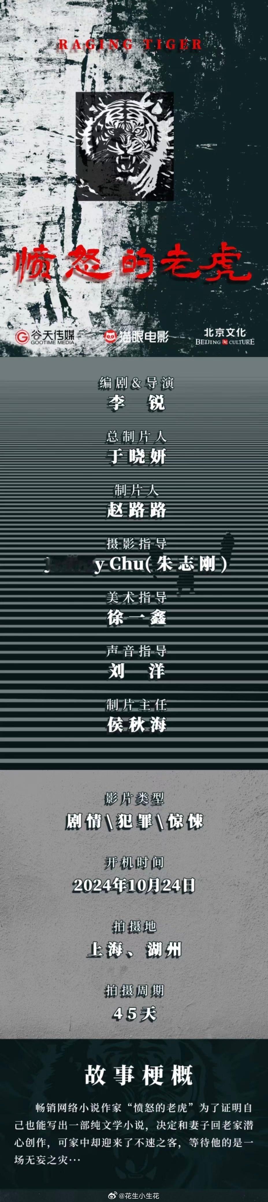 故事梗概:畅销网络小说作家“愤怒的老虎”为了证明自己也能写出一部纯文学小说,决定和妻子回老家潜心创作,可家中却迎来了不速之客,等待他的是一场无妄之灾… #愤怒的老虎开机#