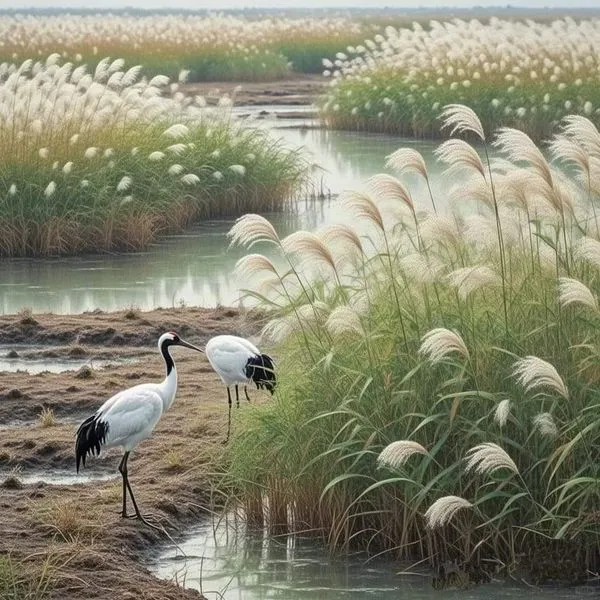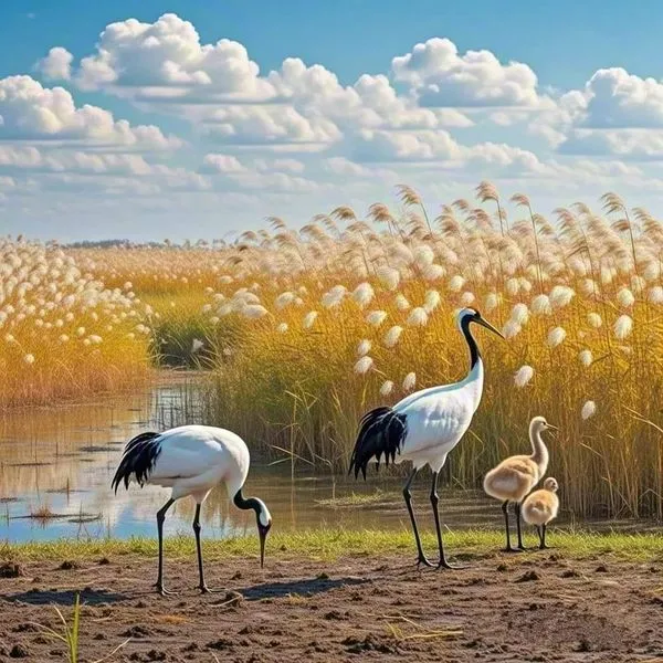在一片广袤的滩地上,大自然展开了一幅令人陶醉的画卷。这里,丹顶鹤优雅地生活着,展现着人与自然的和谐之美。