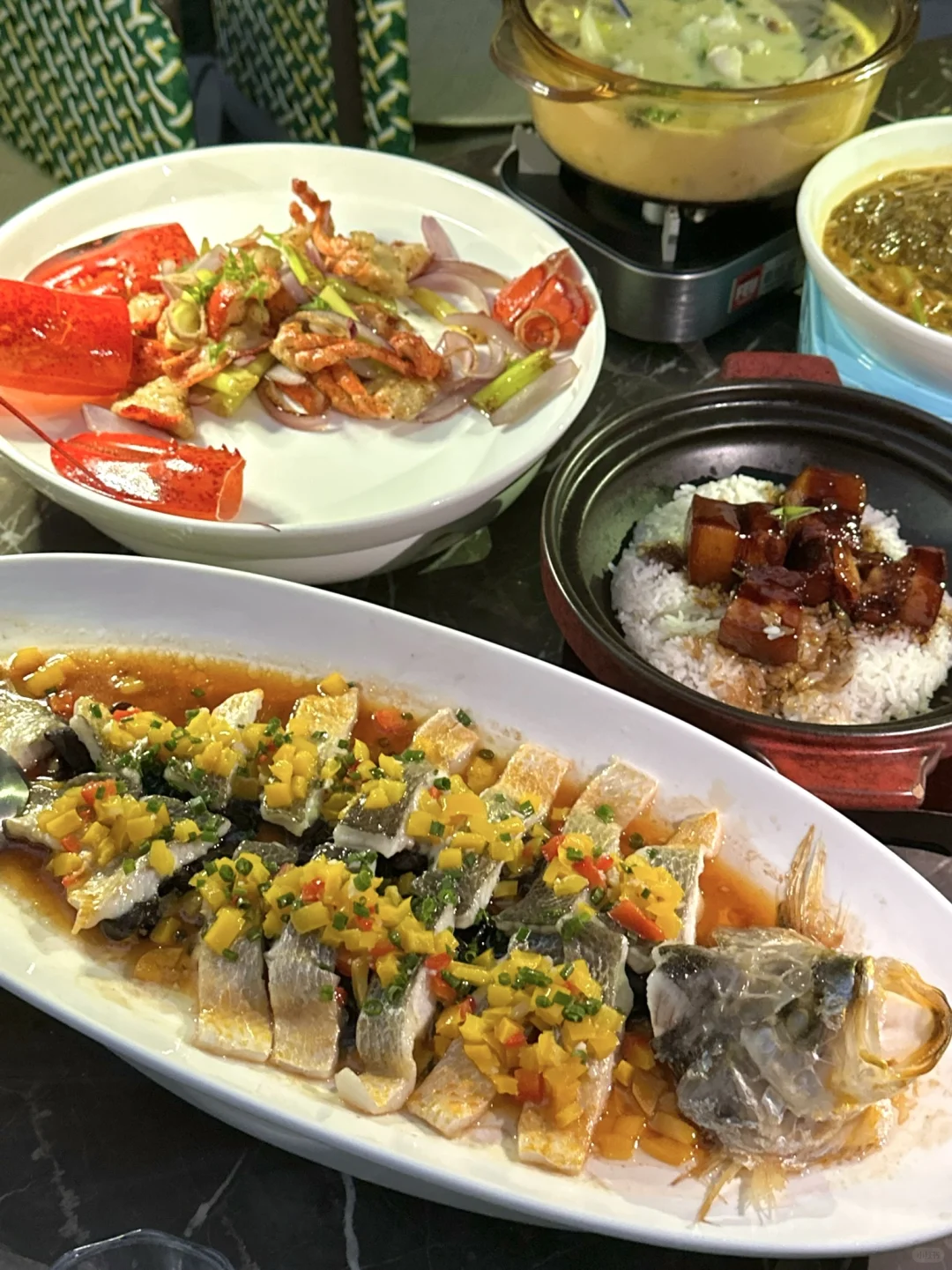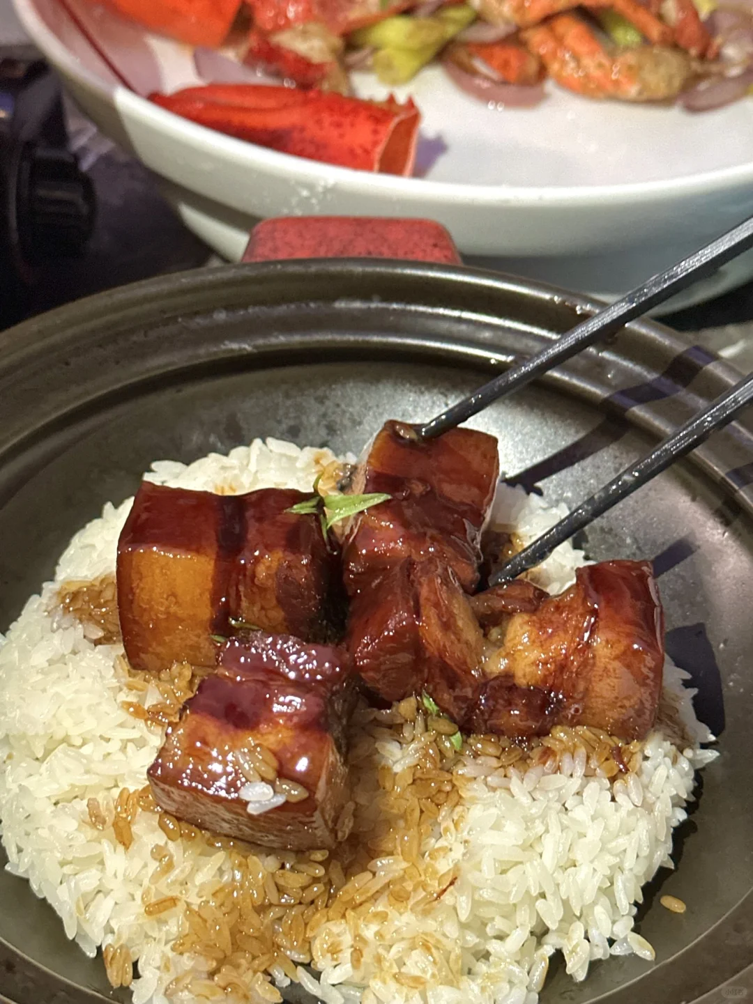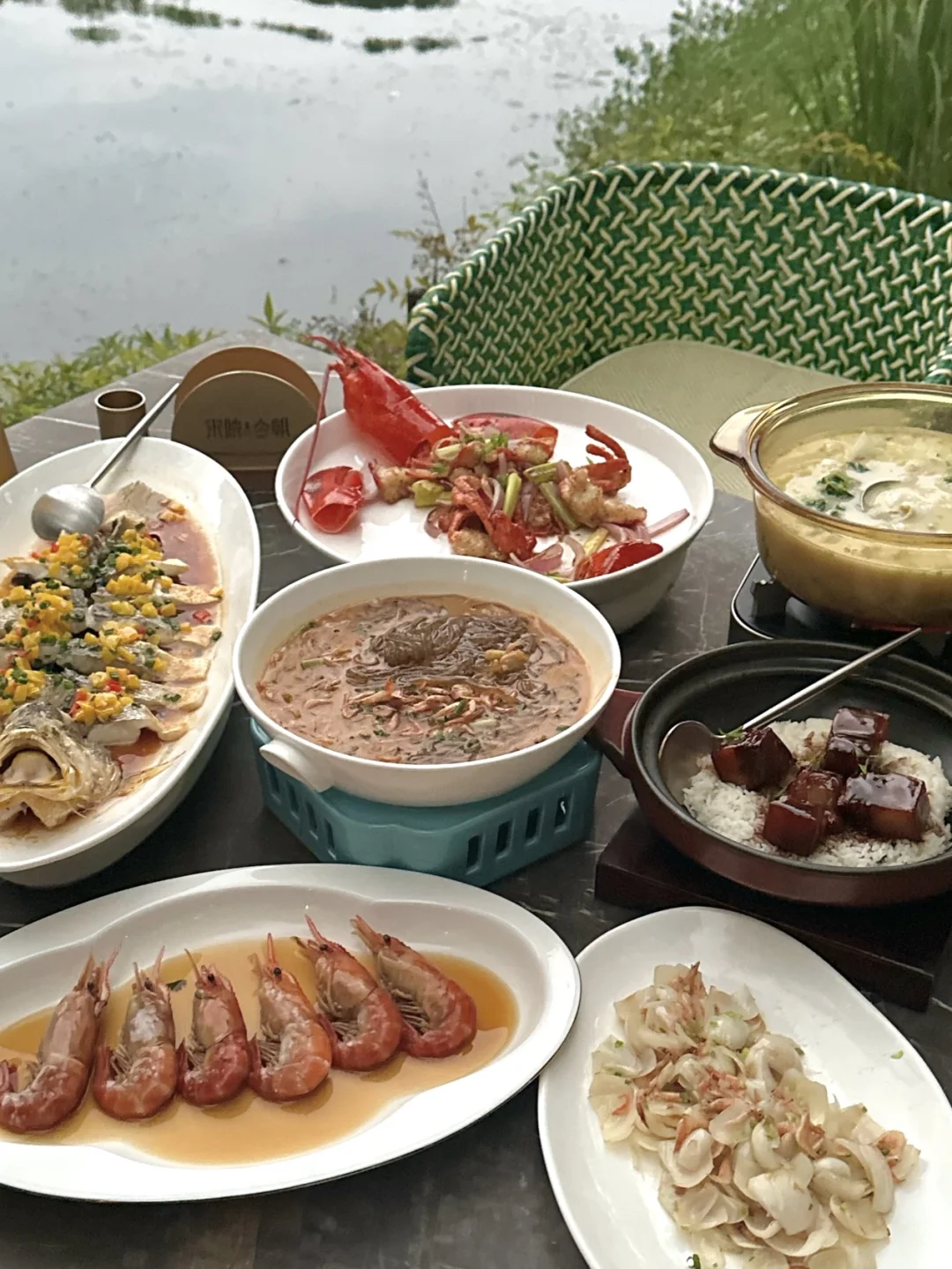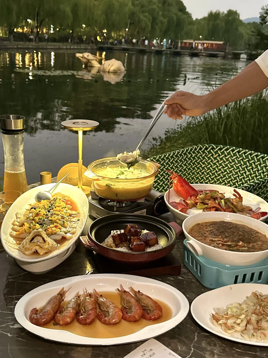 没想到能坐在西湖边看着落日吃饭… 真的太chill了!!味道都很在线! ✔️蛤蜊虾干豆面 这一口豆面真的太鲜了🥹口感丰富 里面还有好多虾干 特别下饭! ✔️老杭州红烧肉 来杭州必吃的!红烧肉软烂入味,肥而不腻! 拌米饭老少都爱!我能吃两碗饭🍚