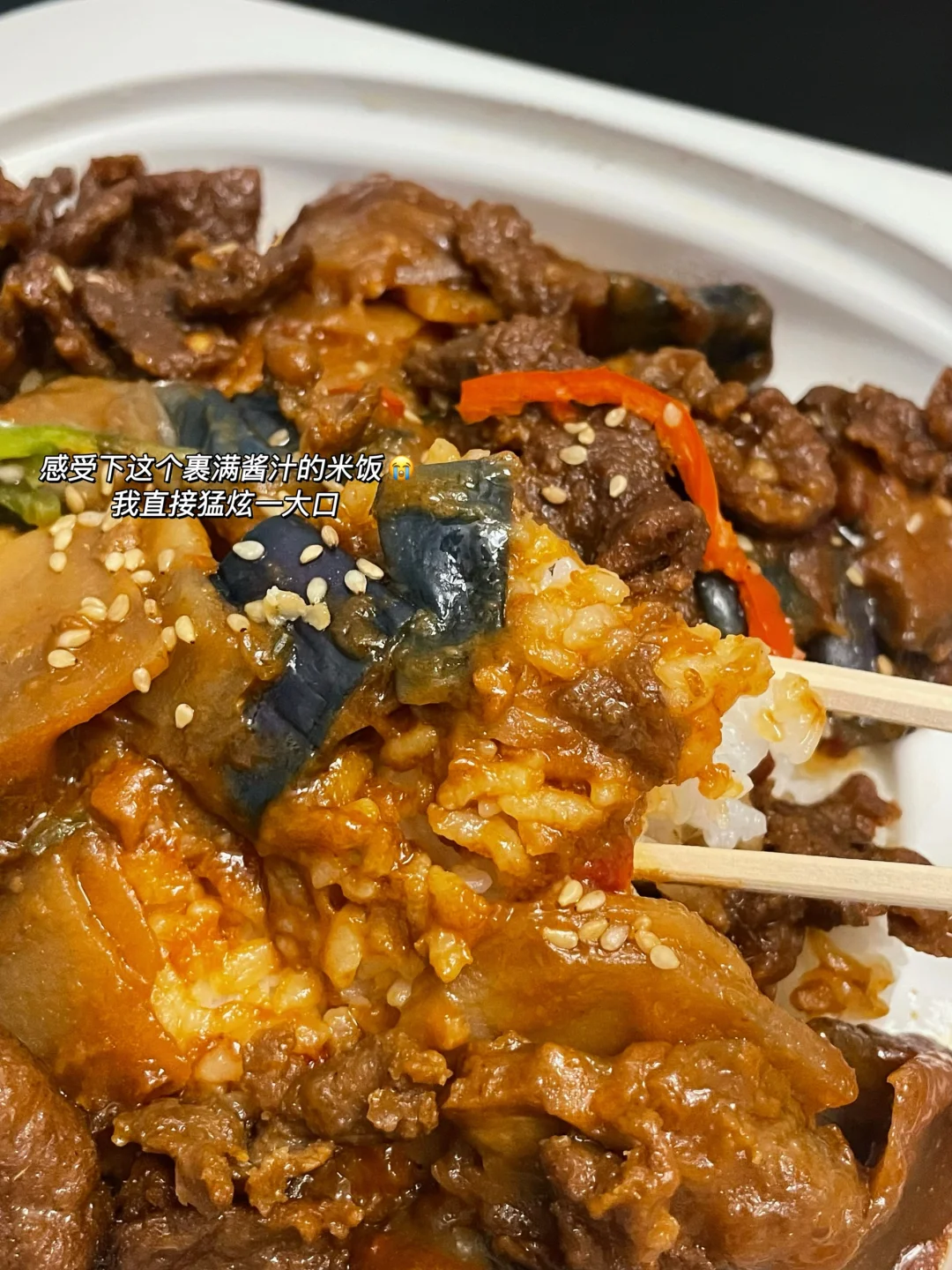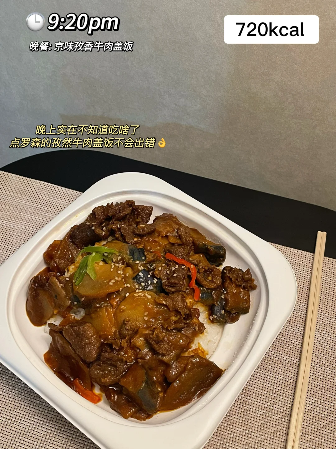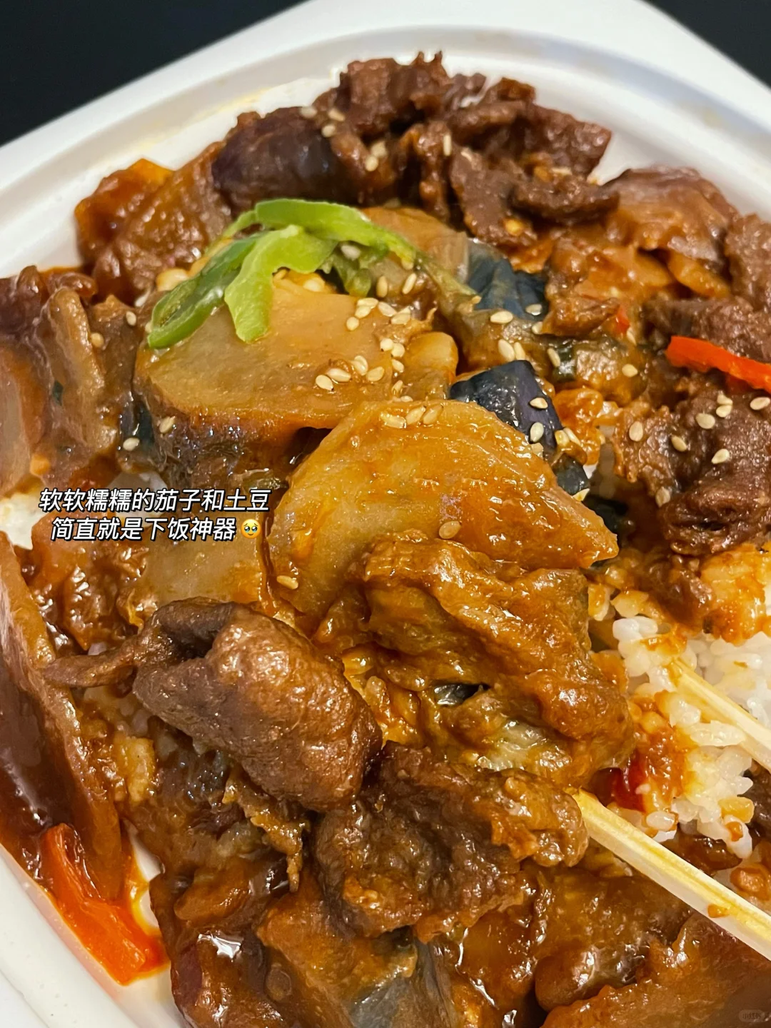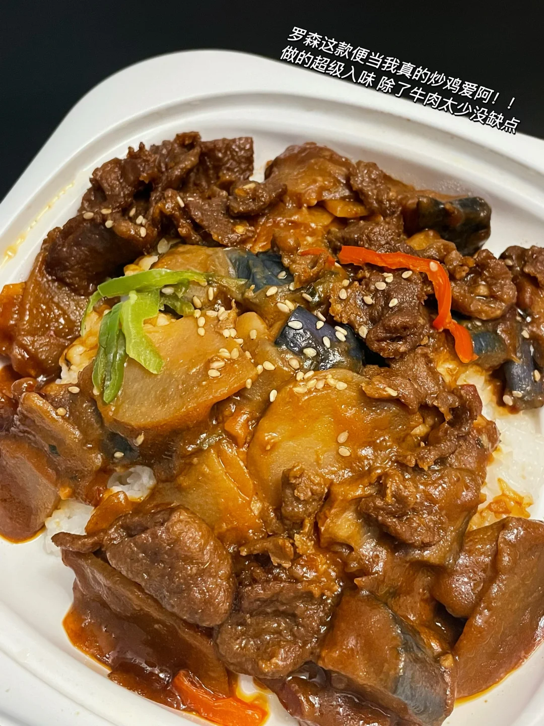· 晚上又点了罗森的京味孜香牛肉饭 这款便当我太爱了 软软烂烂的茄子和土豆裹满汤汁炒鸡下饭!!不过还是建议减肥的宝少吃罗森便当 营养比例太不全了 真的没啥肉..很难吃满足[失望R]