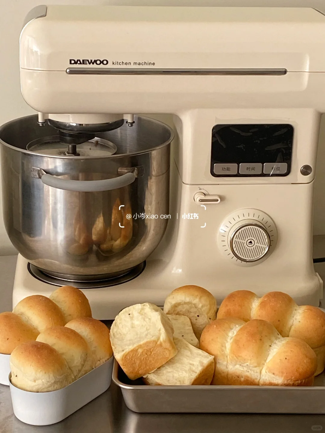 1.除盐、黄油、藜麦饭以外的食材倒入大白象厨师机揉面桶,揉出粗膜的状态加盐、黄油,继续揉至完全扩展阶段,加入藜麦饭,混合均匀;