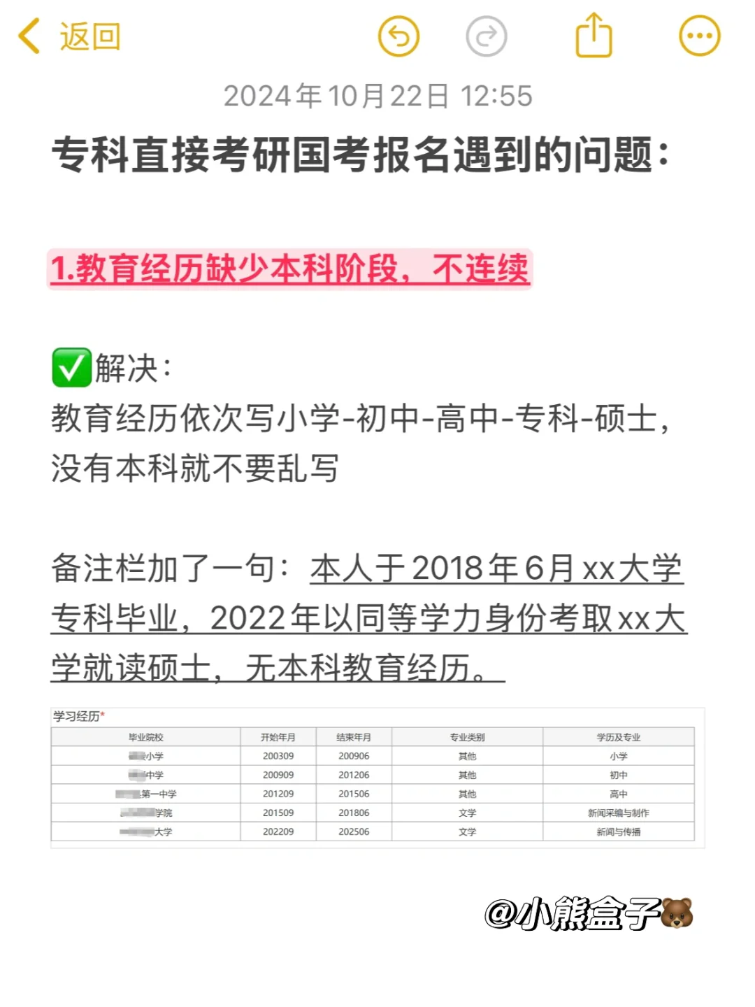 解决:教育经历依次写小学-初中-高中-专科-硕士,没有本科就不要乱写,备注栏加了一句:本人于2018年6月xx大学专科毕业,2022年以同等学力身份考取xx大学就读硕士,无本科教育经历。
