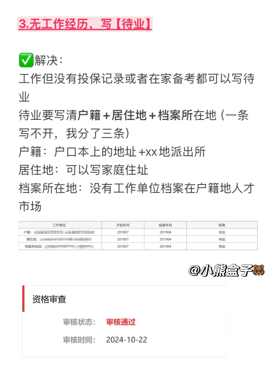 待业要写清户籍+居住地+档案所在地(一条写不开,我分了三条)