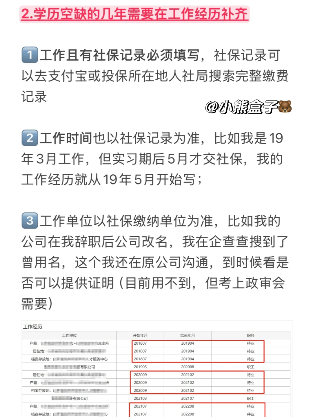2️⃣工作时间也以社保记录为准,比如我是19年3月工作,但实习期后5月才交社保,我的工作经历就从19年5月开始写;