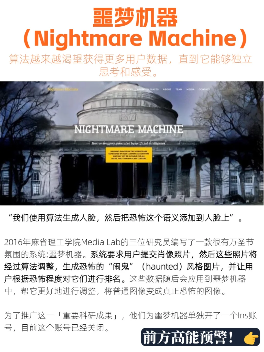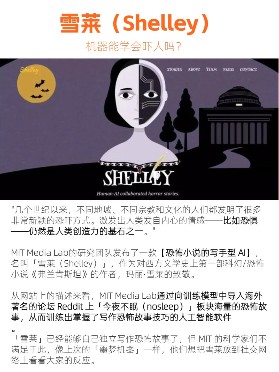 MIT Media Lab通过向训练模型中导入海外著名的论坛 Reddit上海量的恐怖故事,从而训练出掌握了写作恐怖故事技巧的人工智能软件,并让其在社交媒体上和网友共创。