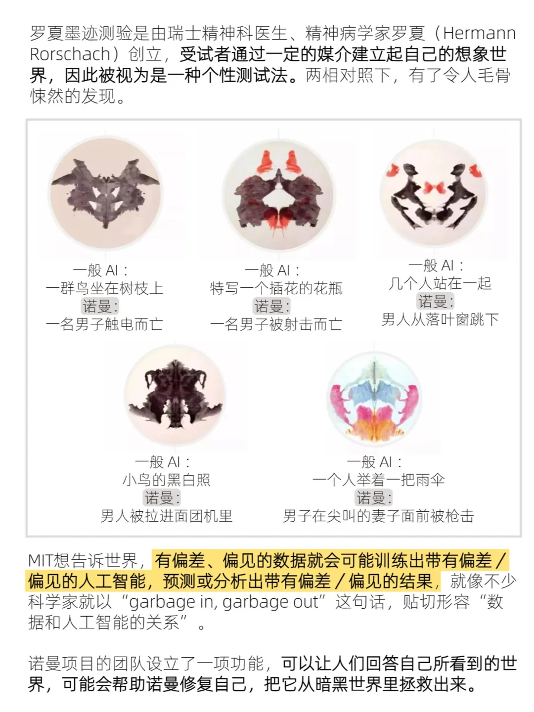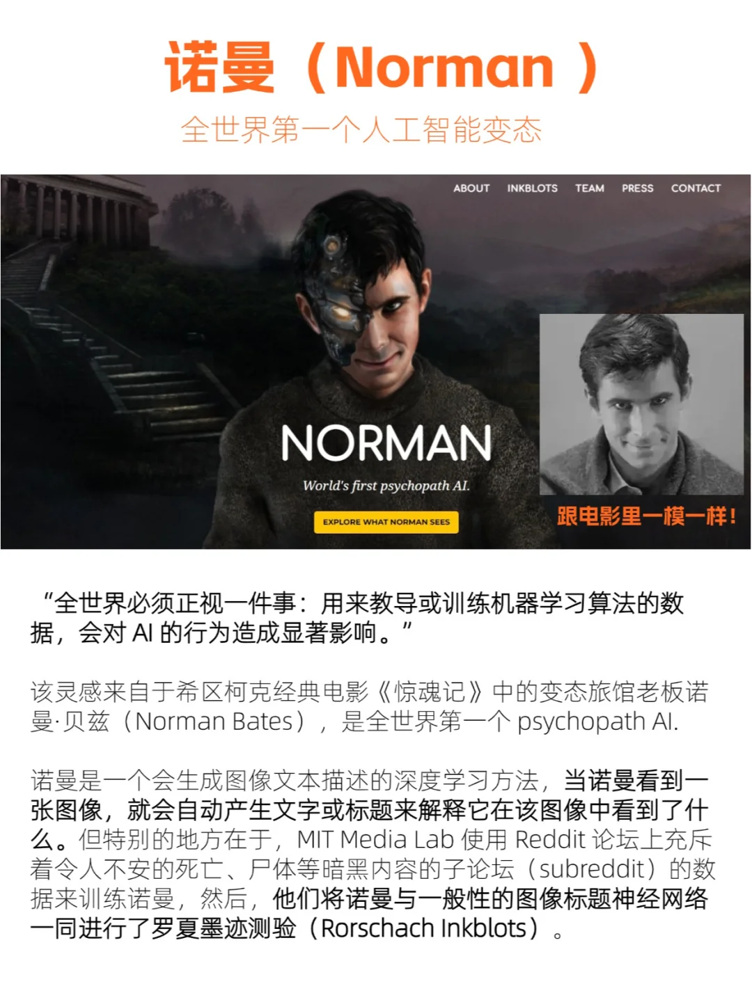 诺曼是一个会生成图像文本描述的深度学习方法,当诺曼看到一张图像,就会自动产生文字或标题来解释它在该图像中看到了什么。由于MIT Media Lab 使用Reddit论坛上的暗黑内容作为数据来训练诺曼,诺曼在精神病学的罗夏墨迹测验(Rorschach Inkblots)中展示出异于常“人”的黑暗面。