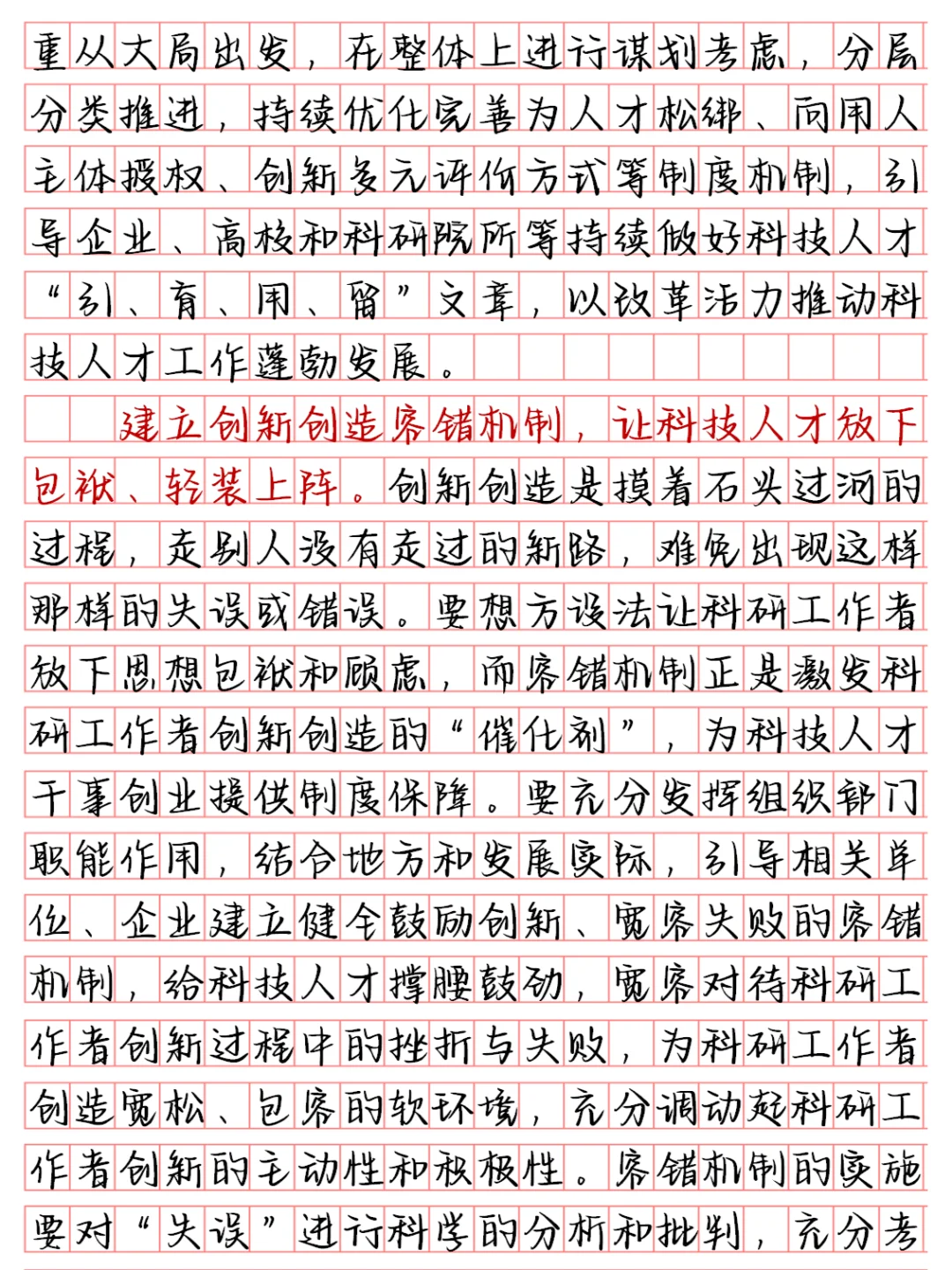 【适用主题】科技人才 【论点分析】 深化人才体制机制改革,让科技人才大展拳脚。 建立创新创造容错机制,让科技人才放下包袱、轻装上阵。 做优人才环境,让科技人才在产业发展中“挑大梁”“当主角”。 【金句积累】 科研工作者是推进中国式现代化的骨干,要拿出“人生能有几回搏”的劲头,放开手脚创新创造,为建设科技强国奉献才智、写下精彩篇章。