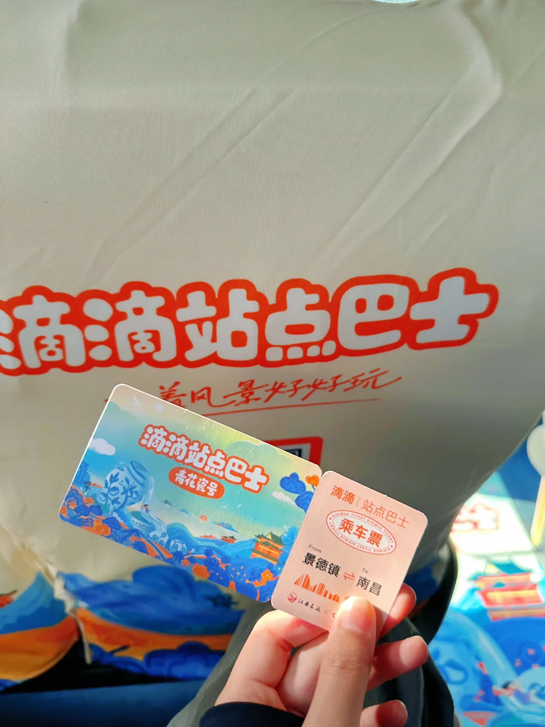 我们这次坐的是【滴滴站点巴士青花瓷号大巴】车身印有滕王阁与瓷器很有江西特色!往返路线都位于核心游玩点!感觉省钱又便利,我的体验感嘎嘎好,而且在车上还欣赏了沿路风景,旅行的体验感一整个拉满🌄座椅很宽敞,坐着很舒适度。司机的服务都很不错💯 !看到我提不动行李还帮了我一把,还能get限定文创周边——冰箱贴和车票!上车司机就给了我一张纪念车票,然后还抽到了冰箱贴,我太惊喜了。哈哈哈!乘车也非常方便直接在滴滴出行app或小程序上预约就行了哦!不管是南昌红谷滩还是老城区出发都有线路,非常推荐的一种出行方式~