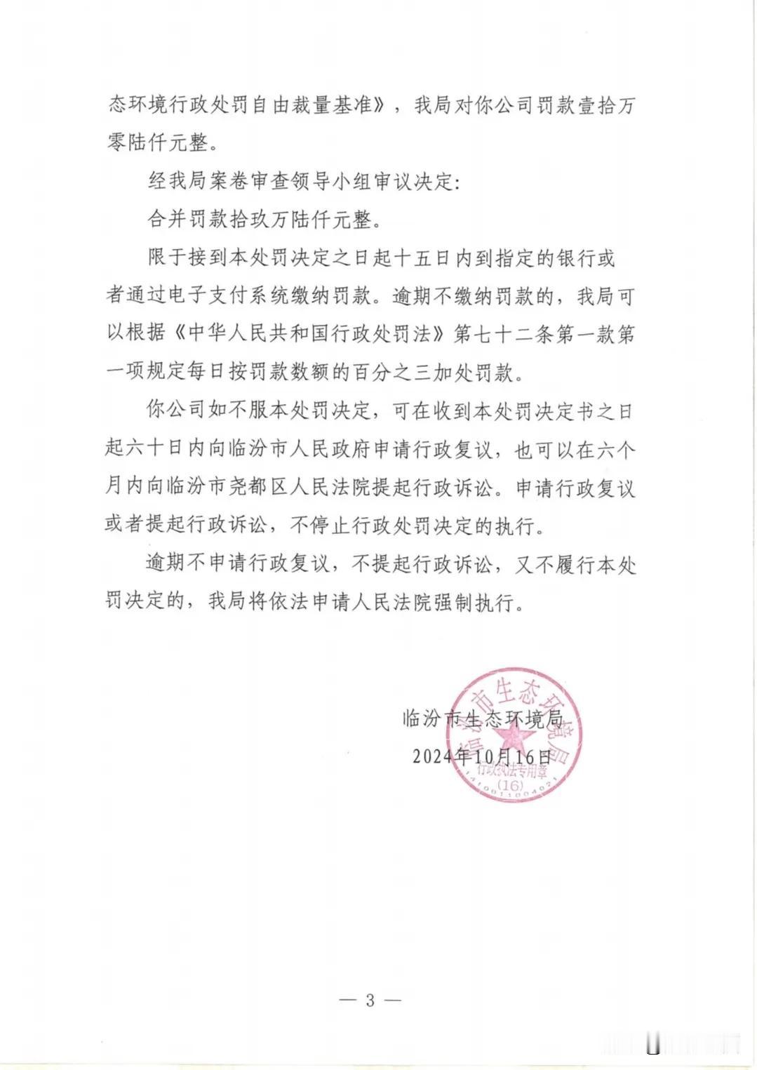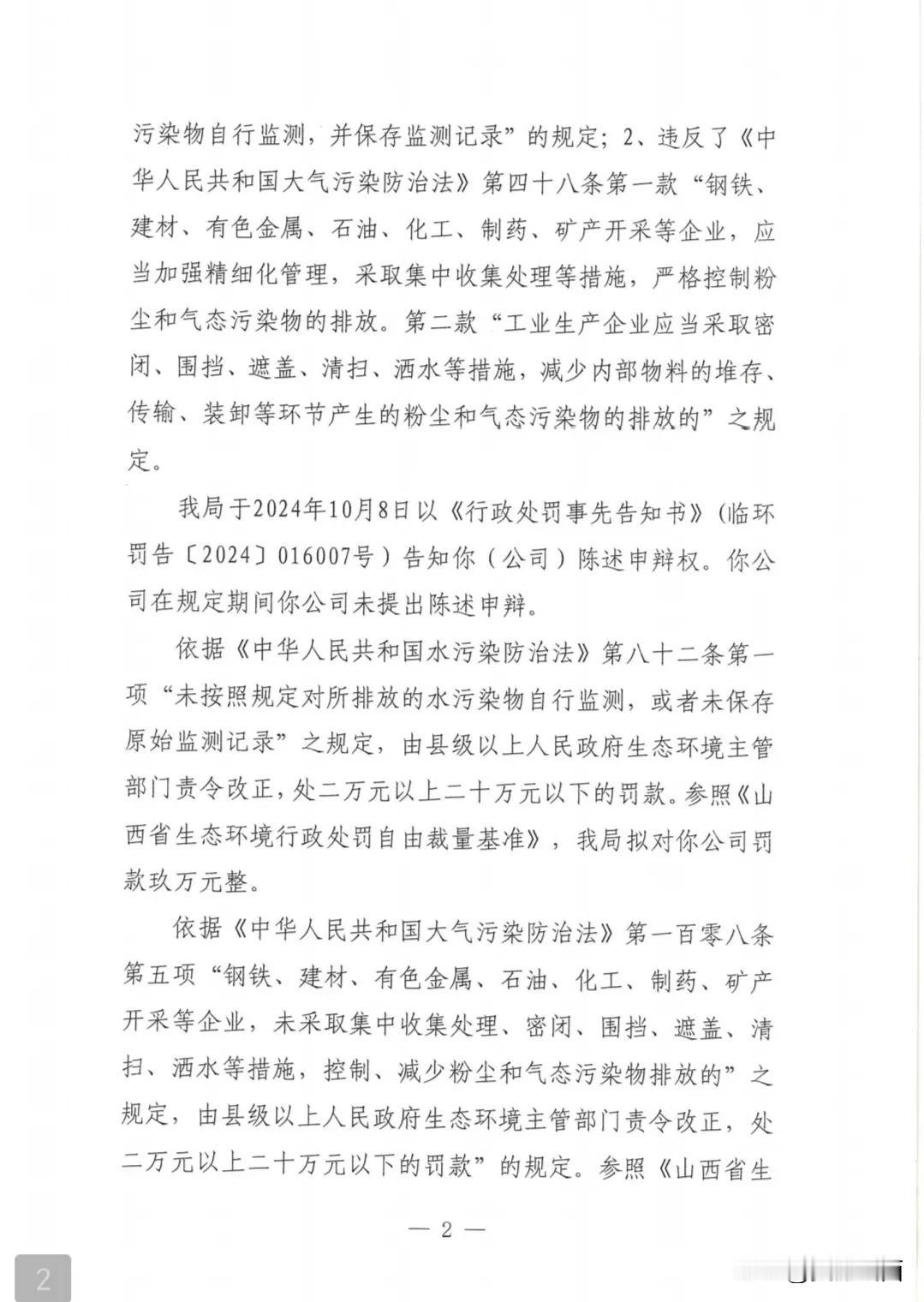 山西汾西正*煤业有限责任公司因原煤露天堆放扬尘污染合并被罚196000元