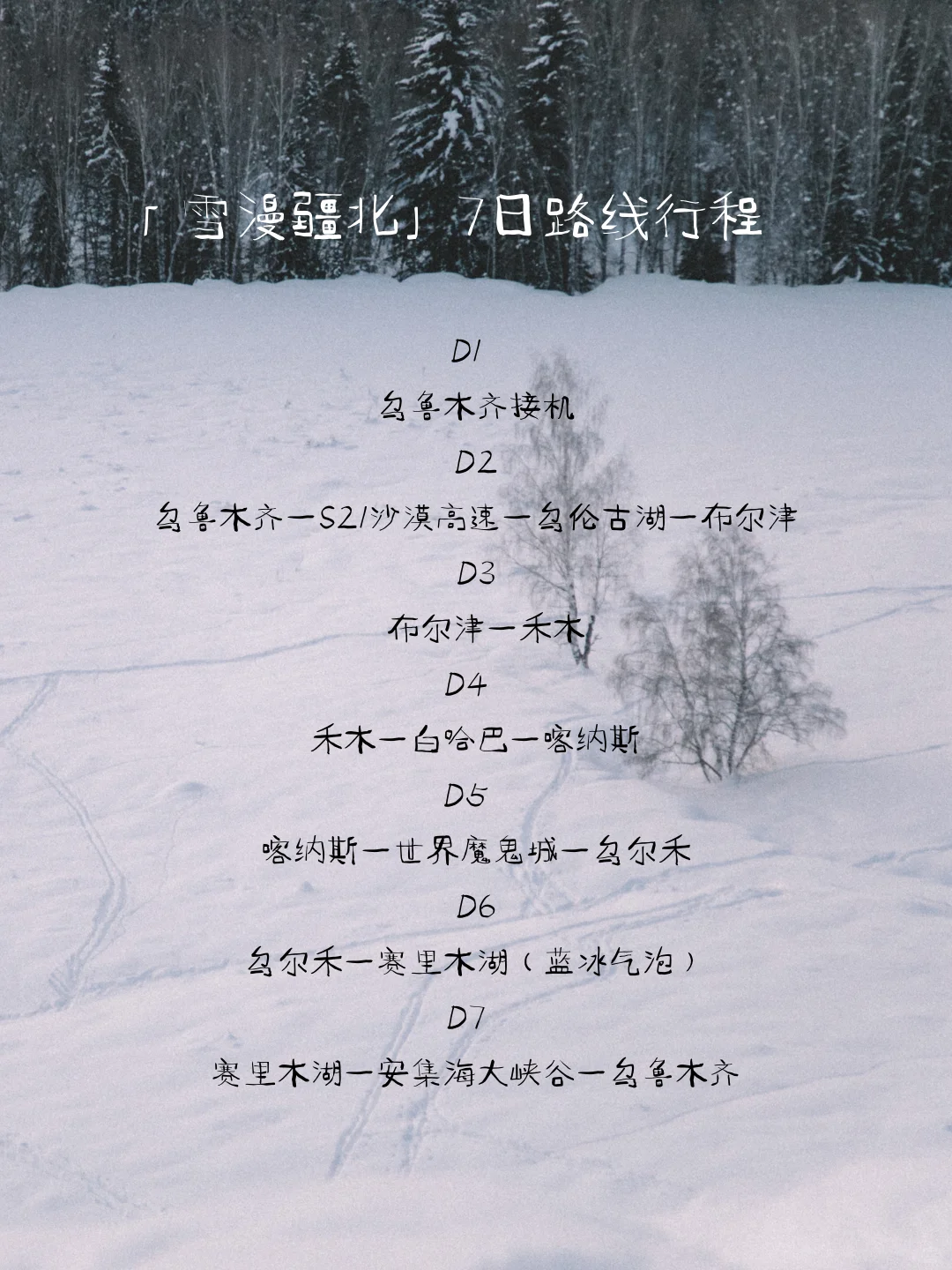 7天6晚的路线设计,北疆冬季的精华景点都能去到,不赶路的同时带您逐帧式赏冬