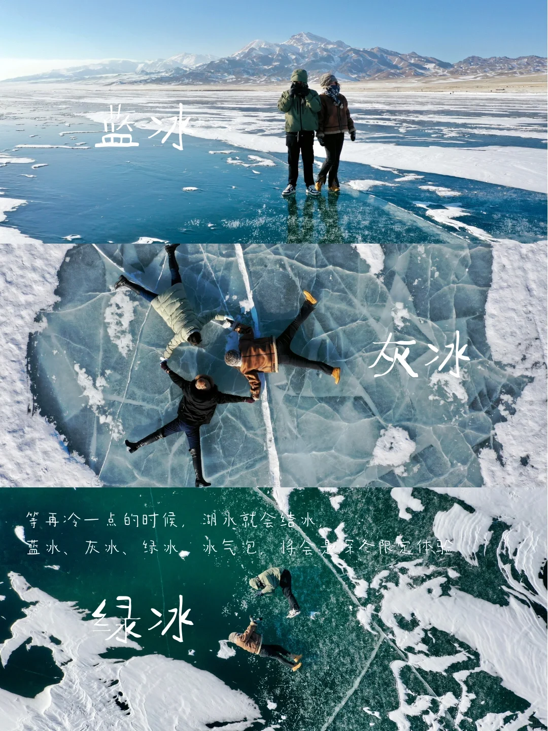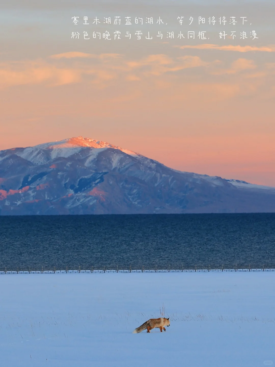 赛里木湖蔚蓝的湖水,等夕阳将将落下,粉色的晚霞与雪山与湖水同框,好不浪漫;等再冷一点的时候,湖水就会结冰,蓝冰、灰冰、绿冰、冰气泡🫧将会是深冬限定体验