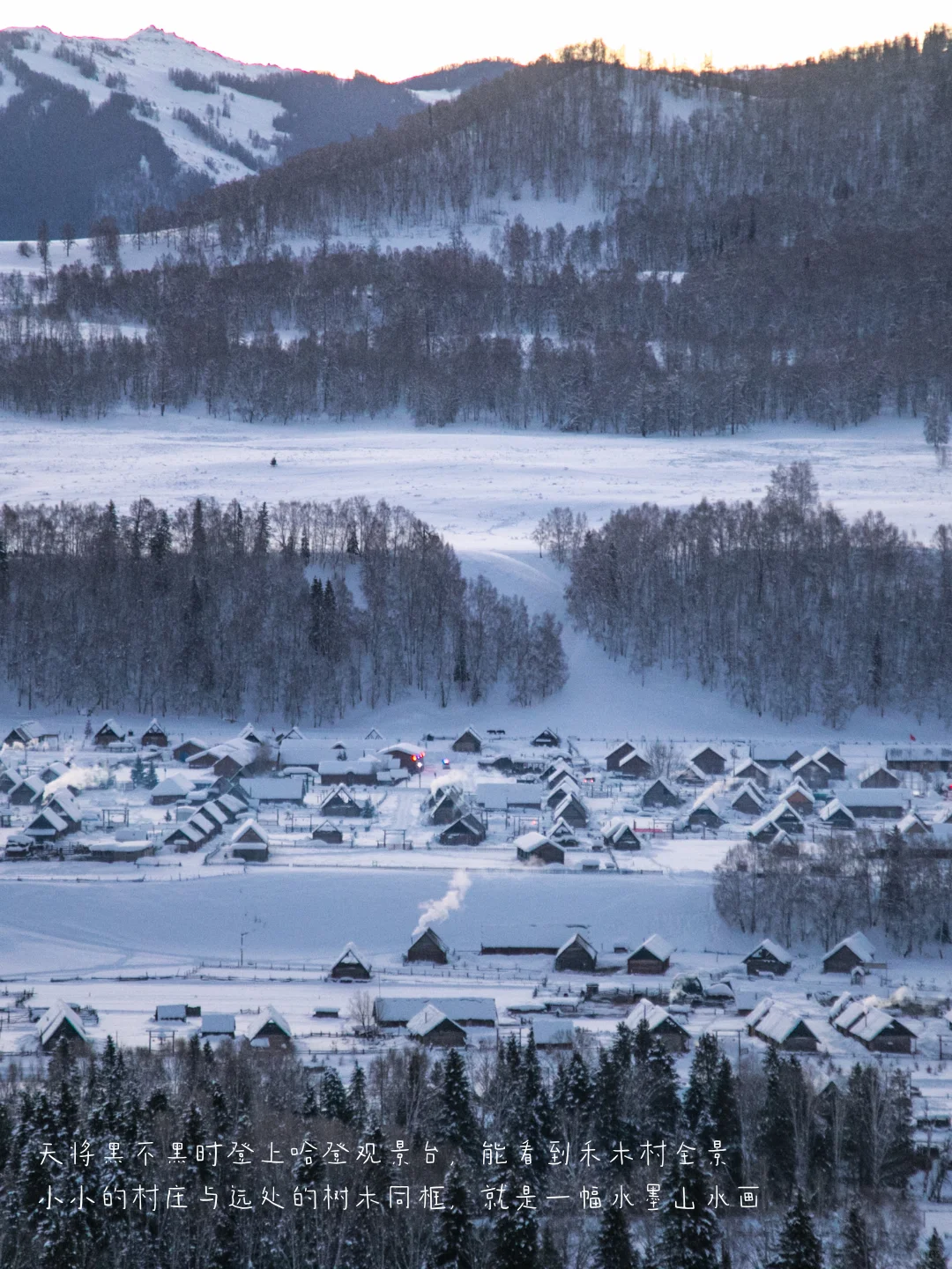 天将黑不黑时登上哈登观景台,能看到禾木村全景,小小的村庄与远处的树木同框,就是一幅水墨山水画