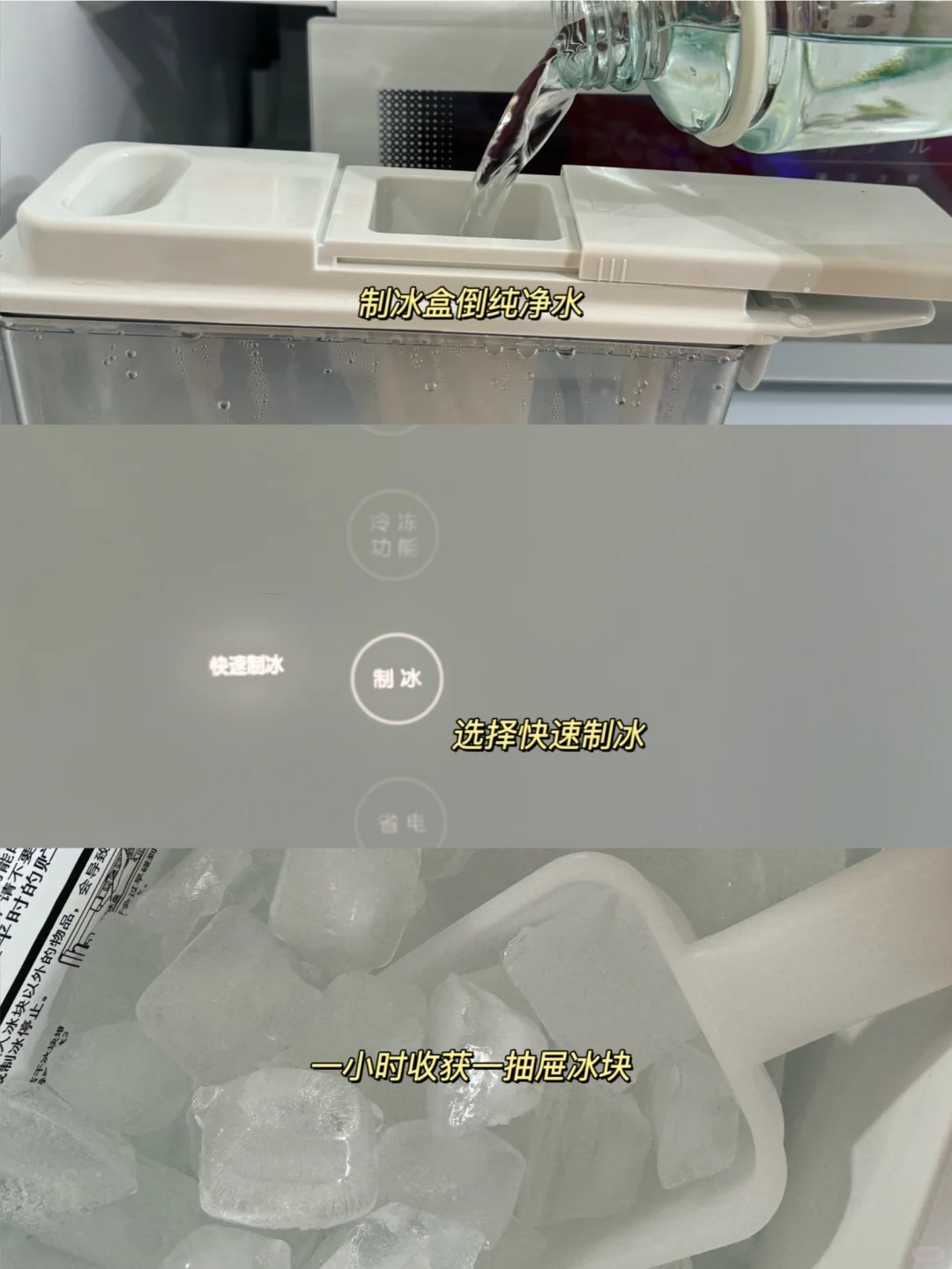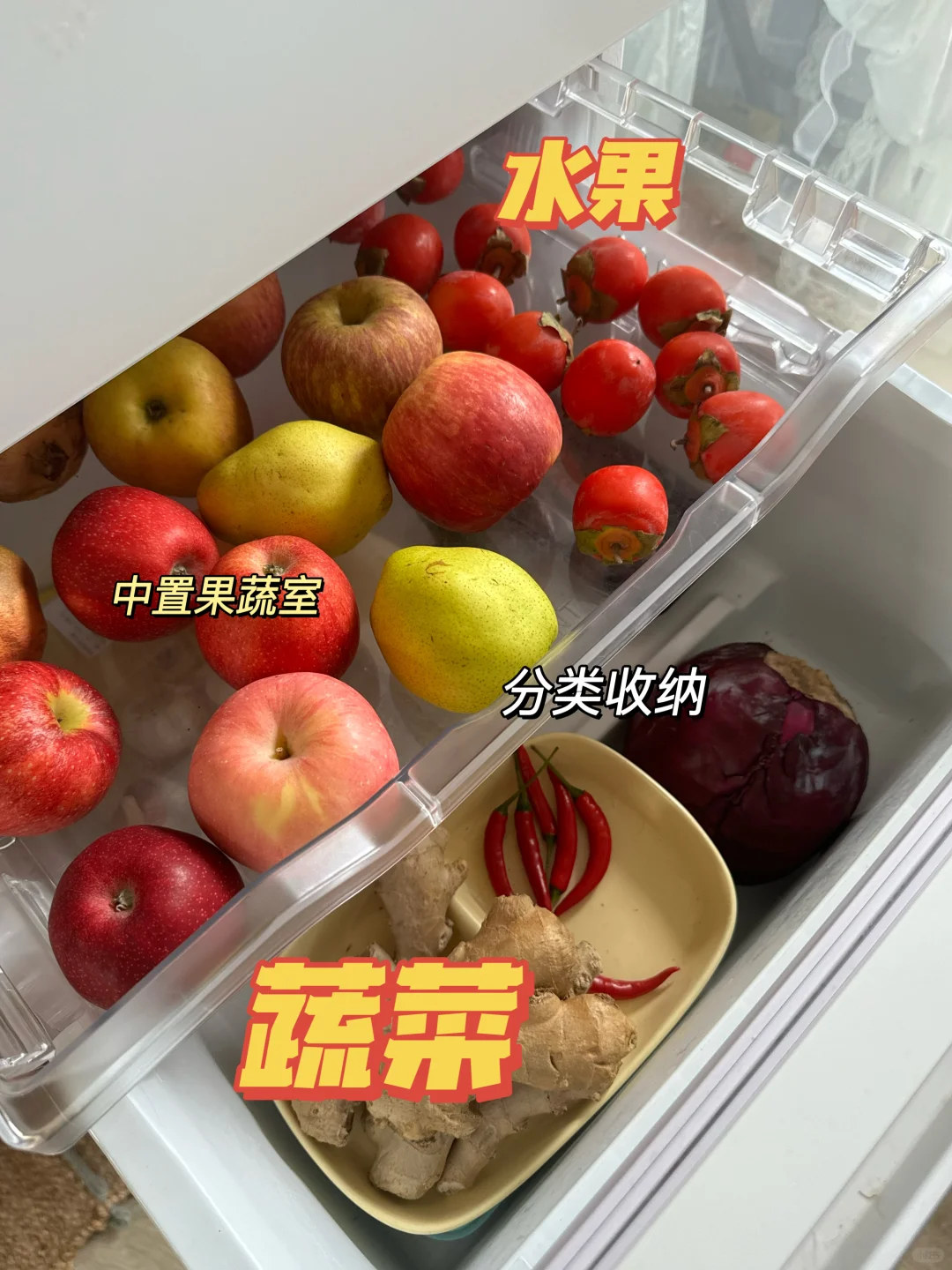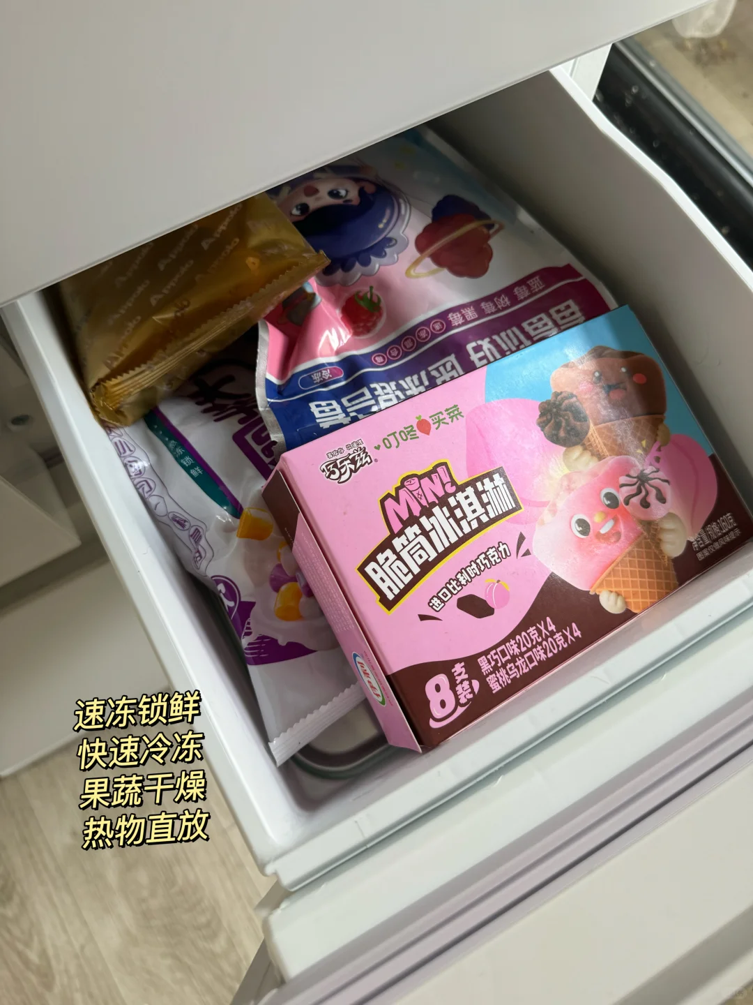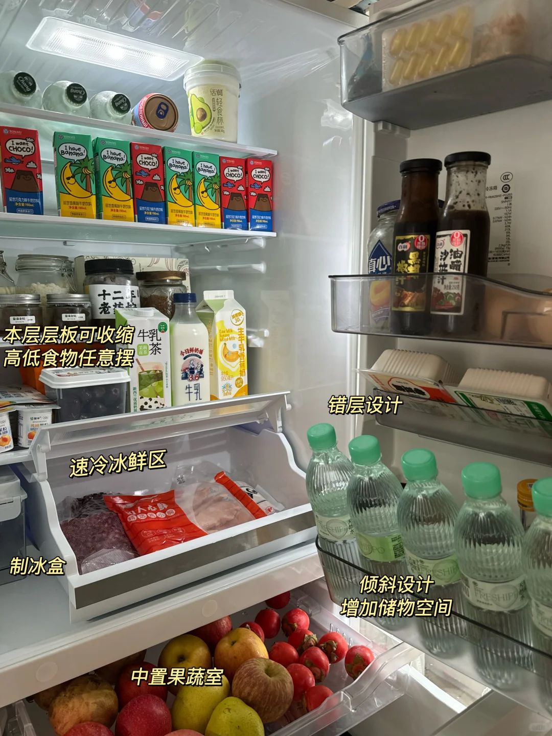 内部分区设计也很优秀,需要快速解冻的肉就放在速冷冰鲜室,可以无血水解冻,错层设计增加了不少储物空间,还有专门的中置果蔬层存在蔬菜和水果,60分钟急速制冰,一小时就能收获一抽屉冰块;下方的冷冻层大肚量也超能装。