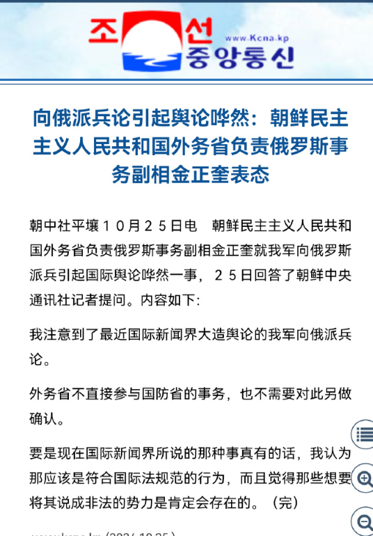 虽然日前俄罗斯和朝鲜都否认了朝鲜向俄罗斯派兵的消息,不过10月25日朝鲜外务省表示,即使朝鲜派兵也是符合国际法的,再度引发朝鲜实际已经派兵的猜测。