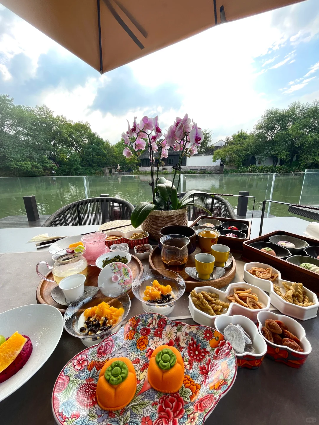 9月-11月的天气凉爽舒适🍂 很适合来西溪湿地逛一逛 忙碌的生活 偶尔放下脚步 来西溪湿地的中式庭院🏡 感受静谧品味人间江南味~ 吃完了午餐不打算走动了 在西溪庄园点一个下午茶套餐 一壶茶🍵几份水果 🍉一些糕点 跟上三五好友花一个下午的时间唠嗑 工作生活的压力全部消失了~ 点心做的很别致 搭配上古色古香的茶具 真是一种很特别的享受!!