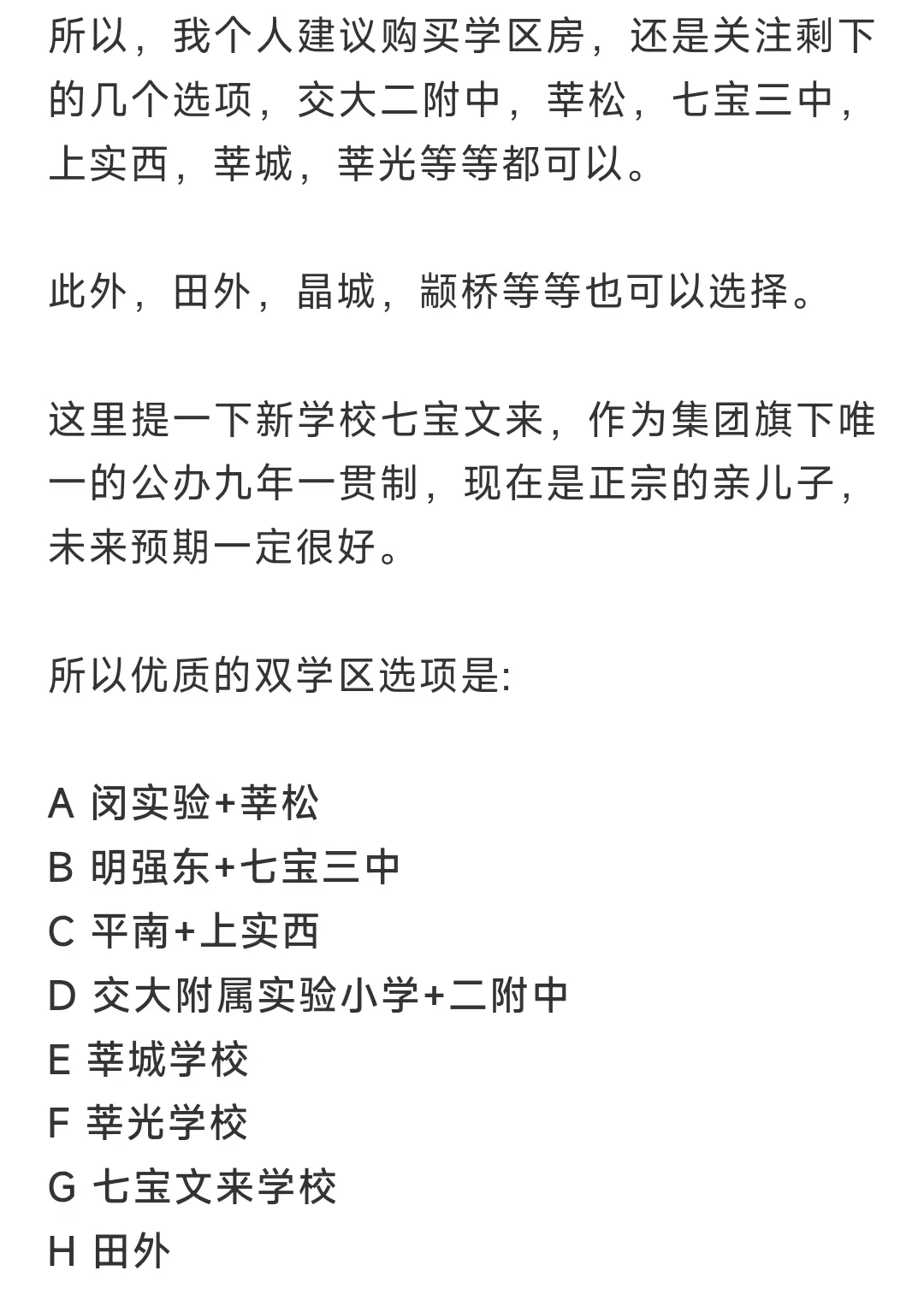 看上去最便宜的是田园外国语。闽实验也很便宜,但是莘松中学航母人好多啊。交大二附中也很好,但是位置真的好偏啊。不过闵行的学区房真的都不贵,性价比不错。