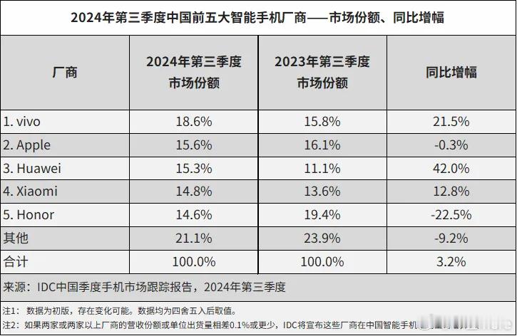 vivo第一,2-4名差距不大,vivo、华为、小米增长,荣耀、苹果下降,OPPO排在第六。