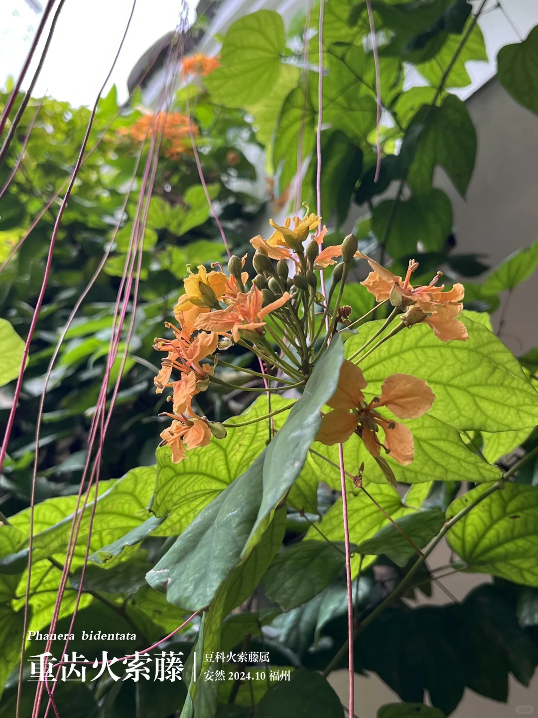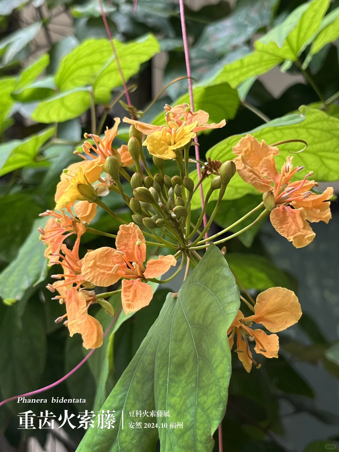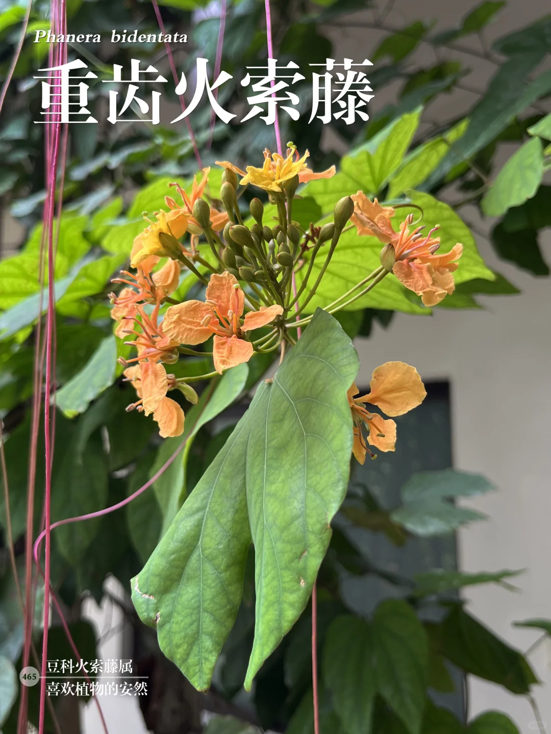 我想,这大概不是羊蹄甲属的植物。想着LD说它来自版纳植物园,那不然看看相关网站,果然发现原来它叫“重齿火索藤”,也被认为是橙黄色的羊蹄甲。“Bauhinia bidentata”是异名。