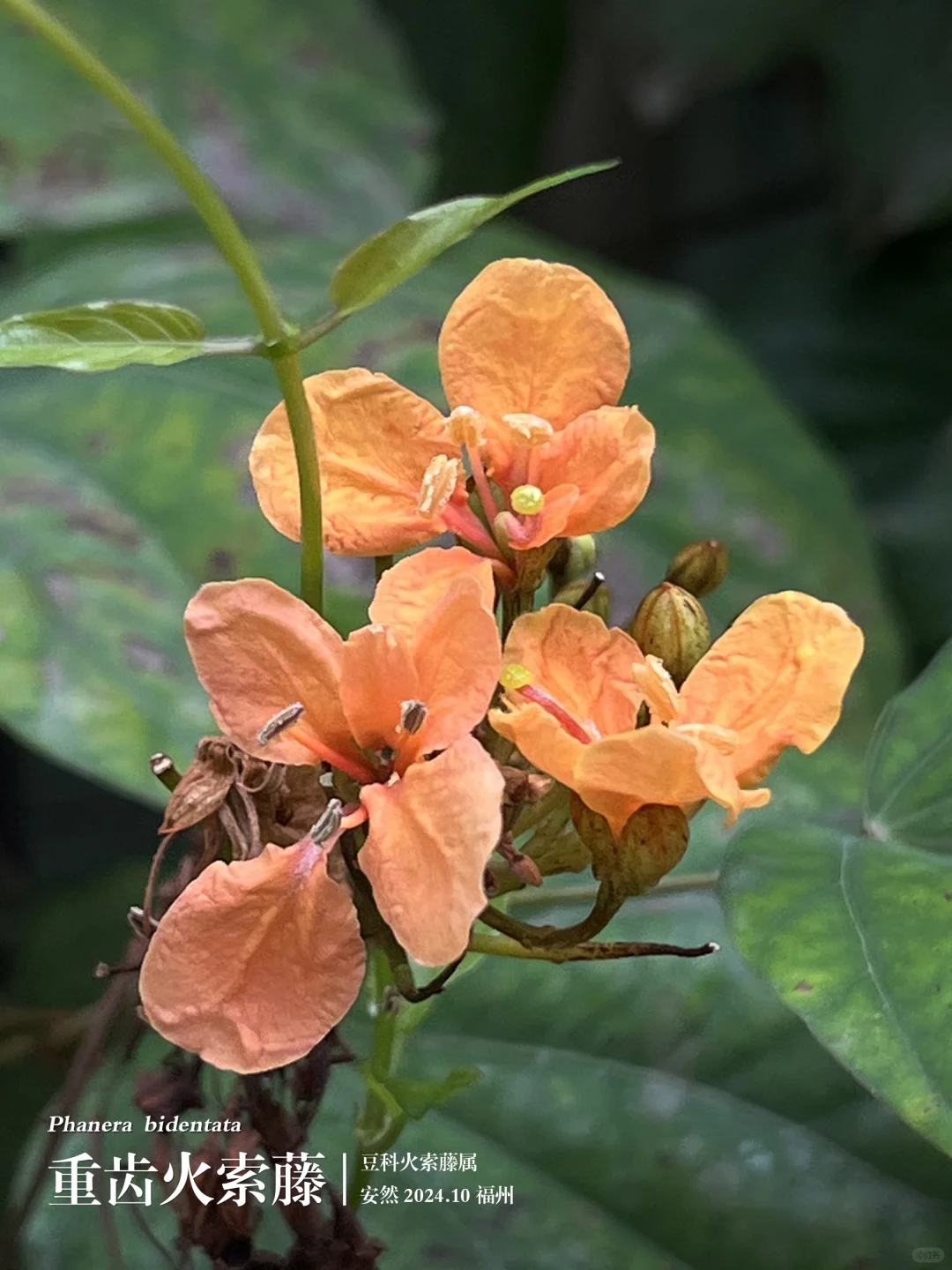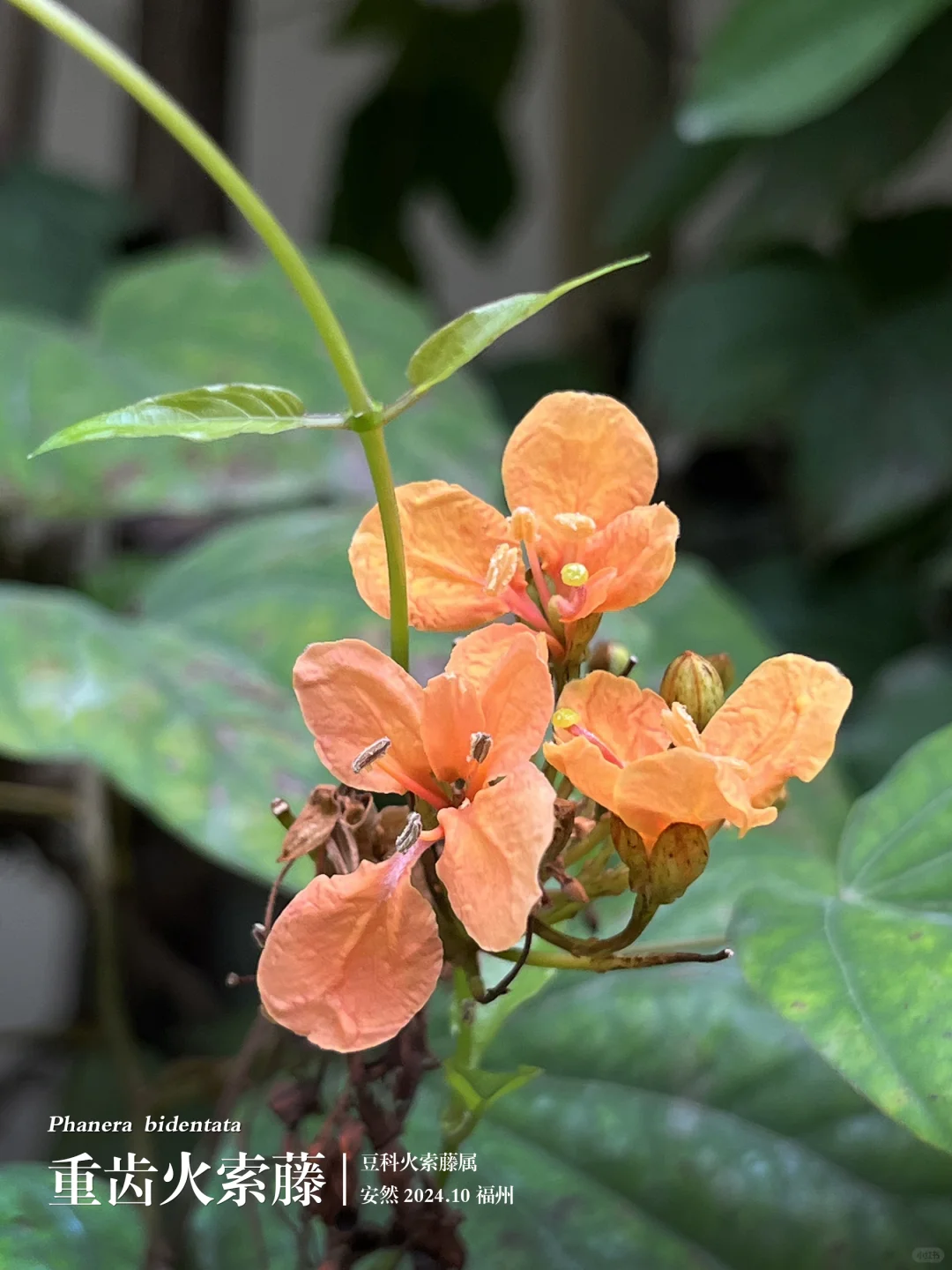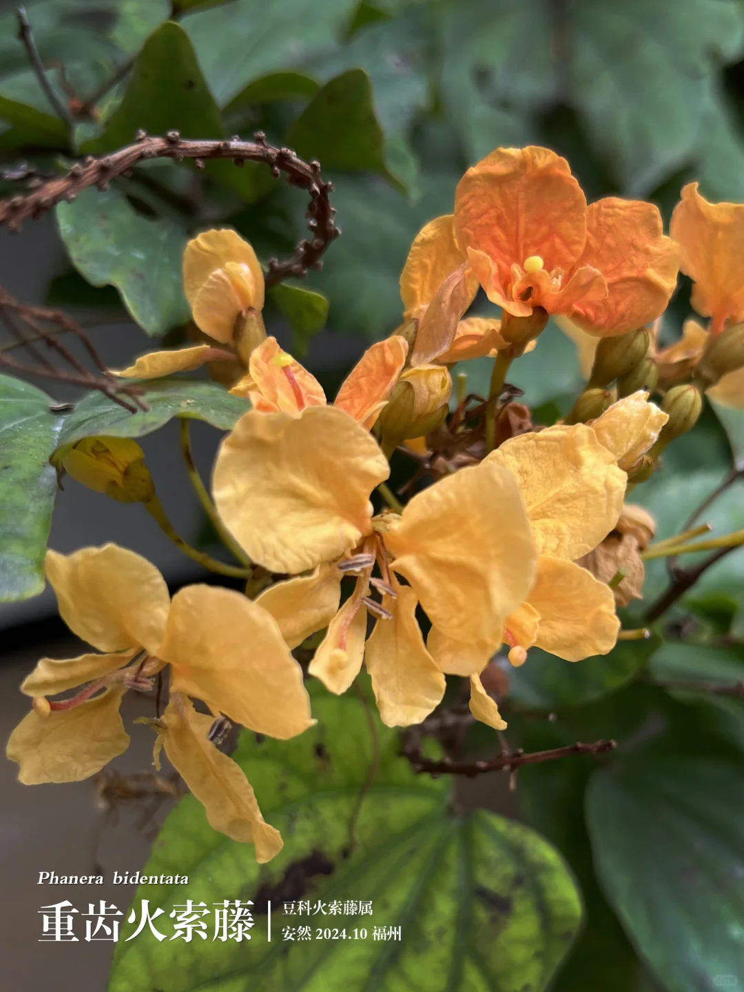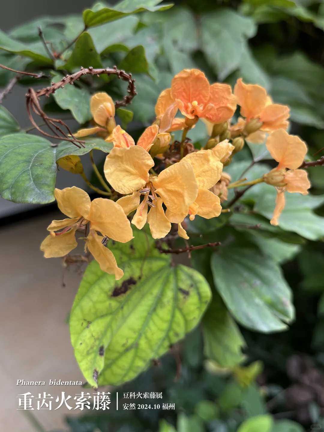 我想,这大概不是羊蹄甲属的植物。想着LD说它来自版纳植物园,那不然看看相关网站,果然发现原来它叫“重齿火索藤”,也被认为是橙黄色的羊蹄甲。“Bauhinia bidentata”是异名。