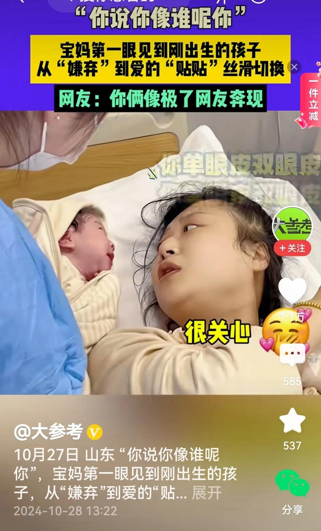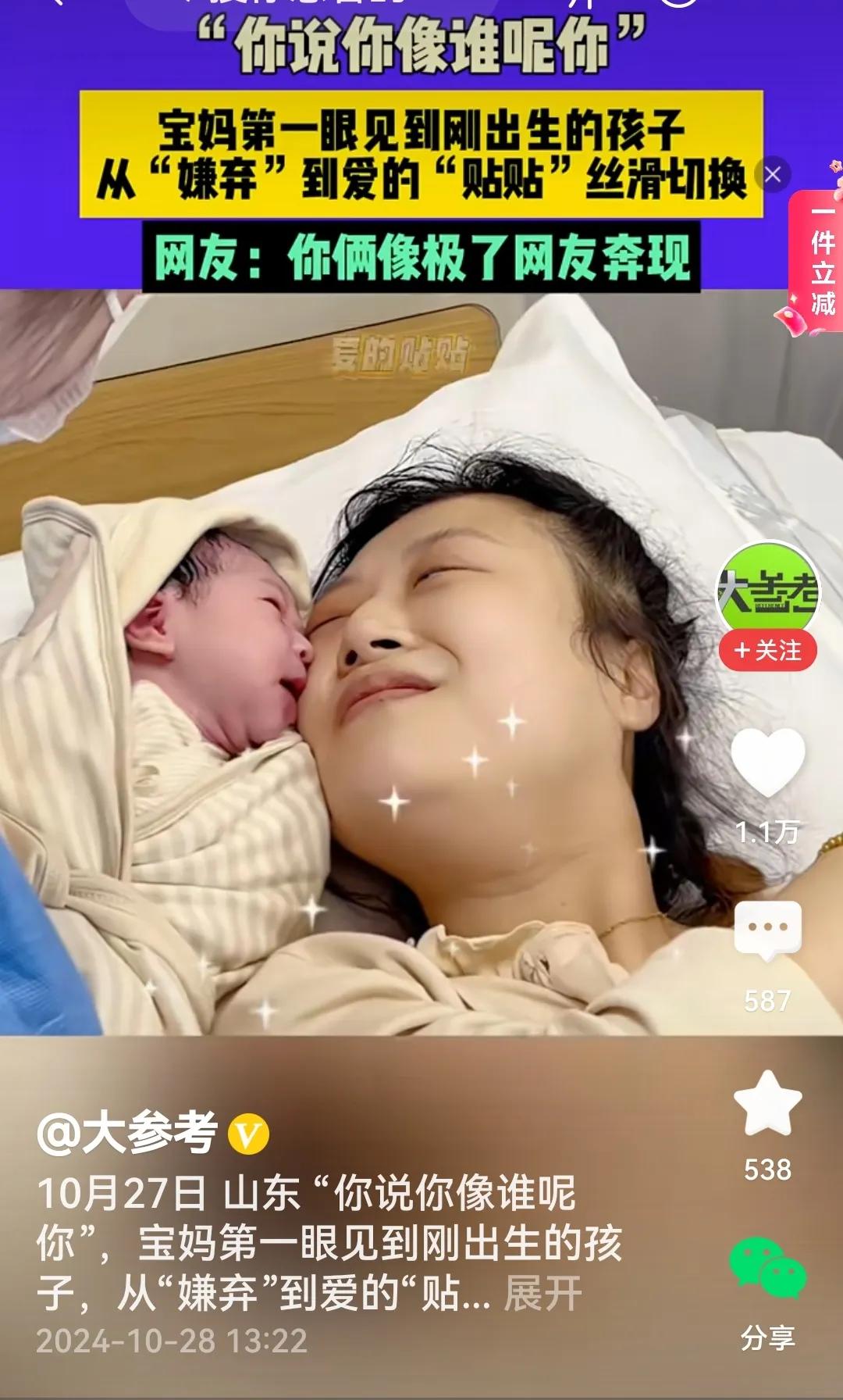 #宝妈见到刚出生的娃像极了网友奔现# 产房里的一幕。 视频里看到,护士把刚出生的宝宝抱给宝妈看,宝妈的第一反应是嫌弃的表情与眼神,同时冒出一句:你说你像谁呢你。可是分分钟,宝妈便与宝宝脸贴脸,如痴如醉,一脸的幸福洋溢开来,心都被融化了。 话说回来,宝妈对刚出生的宝宝反应为啥如此之大呢?唉!这刚出生的宝宝差不多一个样,小脸红红的,眼睛半睁半闭的,着实不怎么耐看,所以一瞬间宝妈露出嫌弃的表情不奇怪。但母性是天然的与生俱来的,宝宝宝宝,无论宝宝长得什么样,那毕竟是自己身上掉下的肉啊!随之母性便漫延开来,啊!宝宝,我的作品问世了。 再者,宝宝多大才好看呢?老话说得好,三个月看孩儿,或者说宝宝三个月大时便耐看了,亦或者说宝宝三个月后才越看越喜欢,总是看不够。等到宝宝喊出第一声“妈妈”时,宝妈才真的醉了,此情此景,宝妈会无比激动颤抖着说:再叫一声,再叫一声…… (个人观点,内容取材于网络)