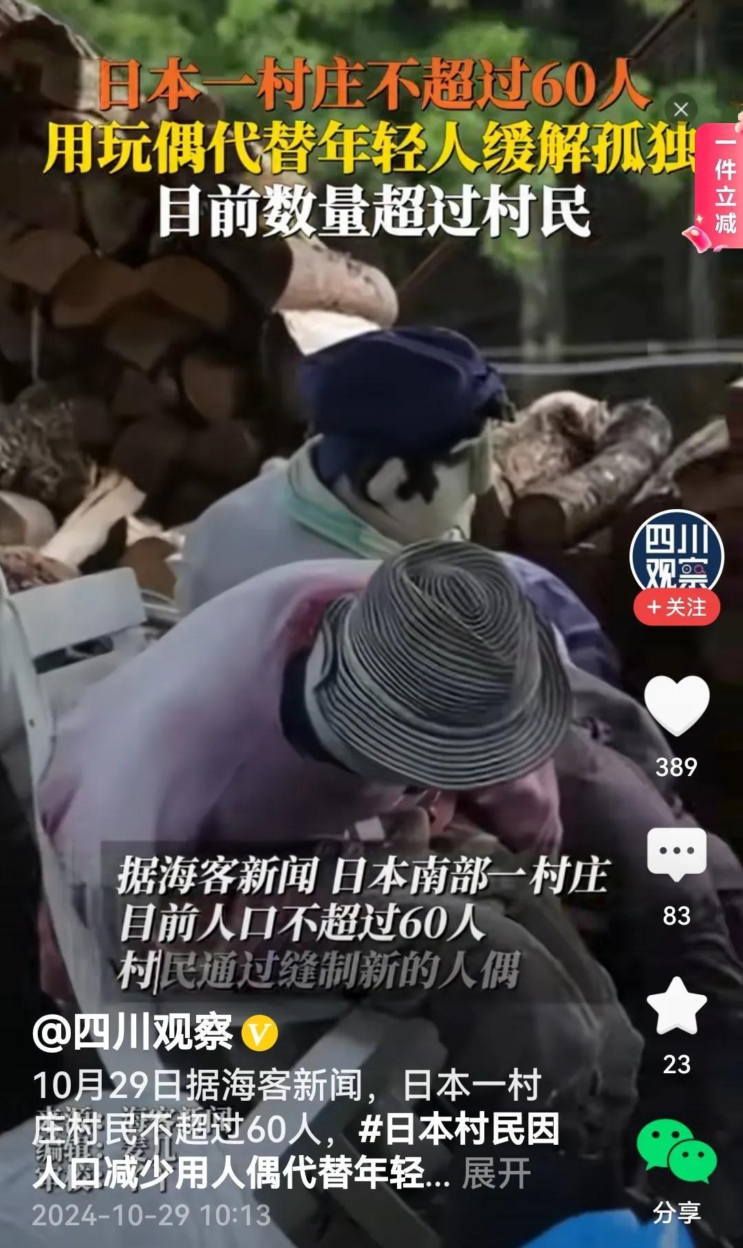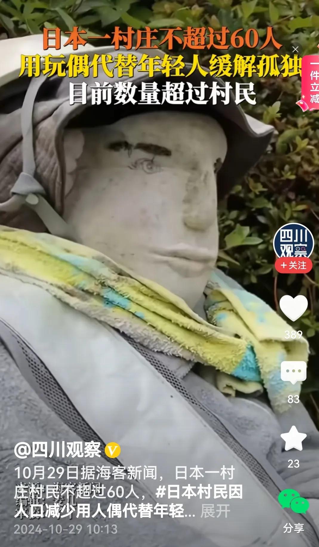 #日本一村庄人太少 放人偶缓解孤独# 是的,如果一个村庄人太少,尤其没有了生龙活虎的年轻人,这个村庄难免会寂寥。咋办呢?日本的这个村庄的村民缝制人偶,放在村里的各个角落,以此来疏解内心的孤独。正所谓: 没有生气人偶代, 望梅止渴很无奈。 孤独本是人心事, 岂是假人能释怀? (个人观点,内容取材于网络)