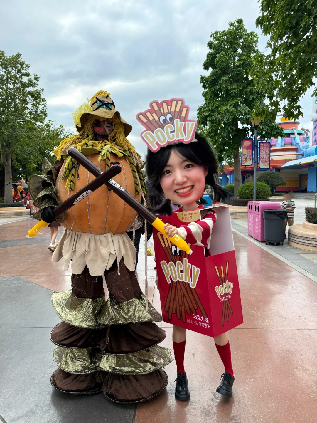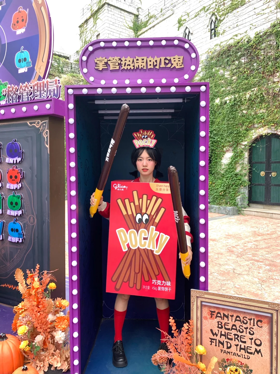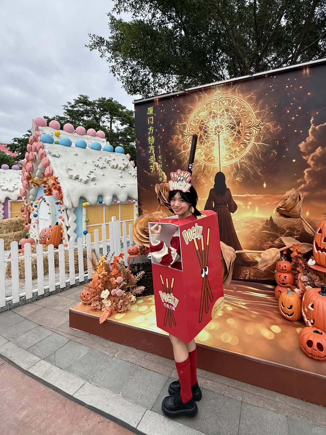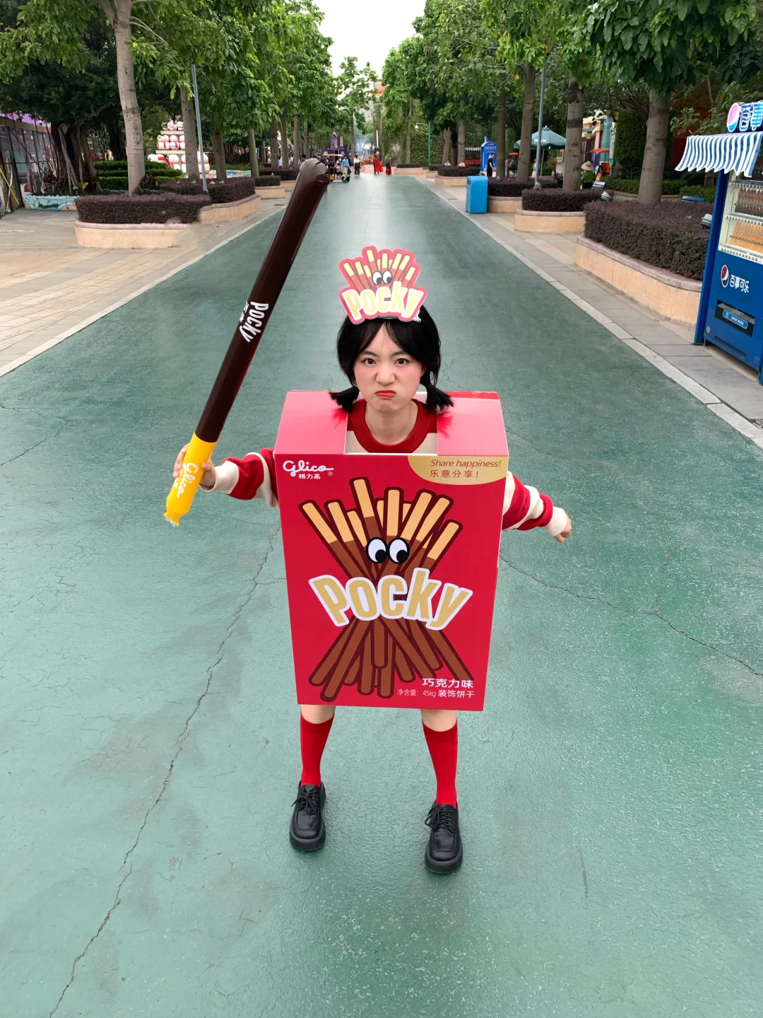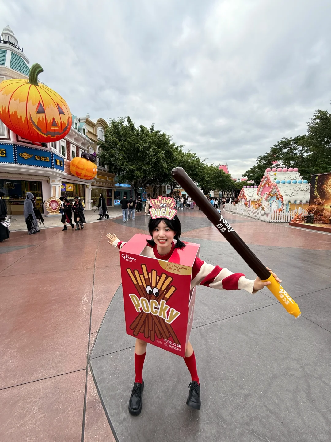 自己用kt板diy了百奇巧克力饼干盒🍫 万圣节穿去乐园拍照玩,简直是回头率满满😭!! NPC都好热情陪我拍照~