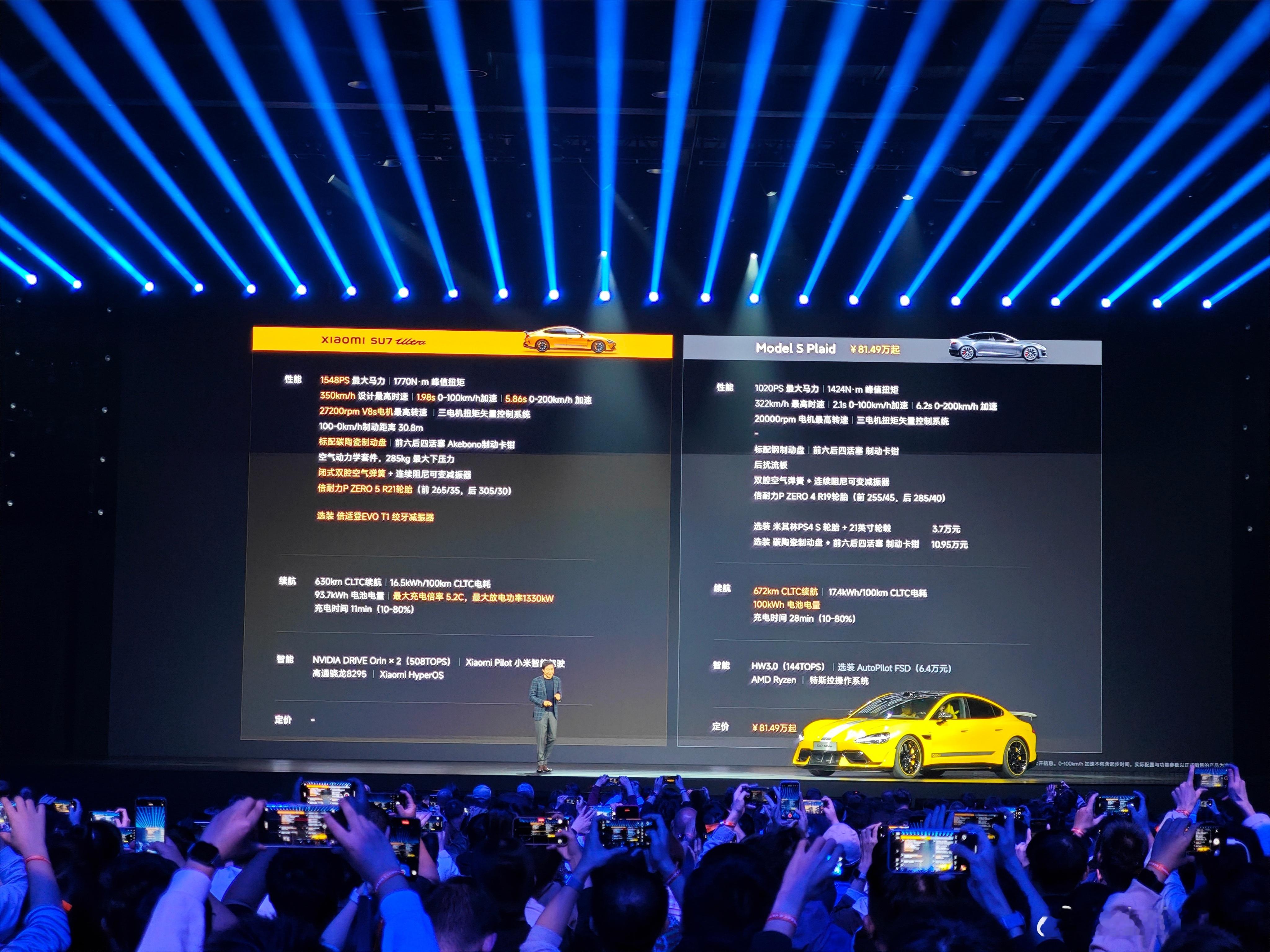 昨天晚上开始预订后,小米SU7 Ultra十分钟小订就突破3680台,看来大家对SU7 Ultra还是很认可的,虽然预售价是81.49万,但它的核心配置要超过同价位的满配特斯拉Model S Plaid很多,贵的有诚意。三电机、赛用麒麟电池、绞牙避震+碳陶刹车盘+阿基菠萝卡钳,都堆满了。