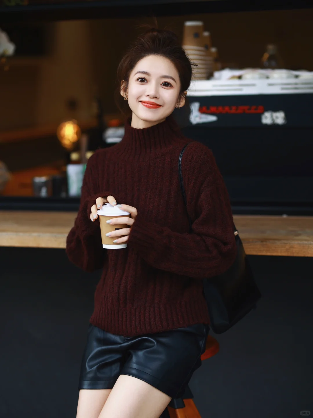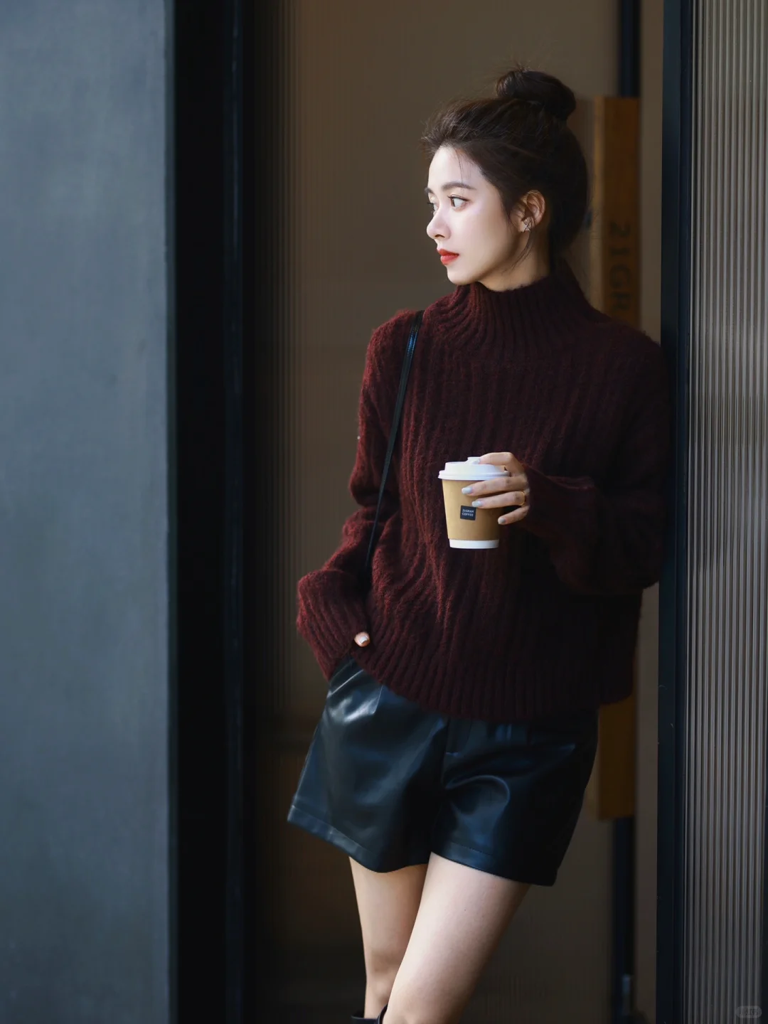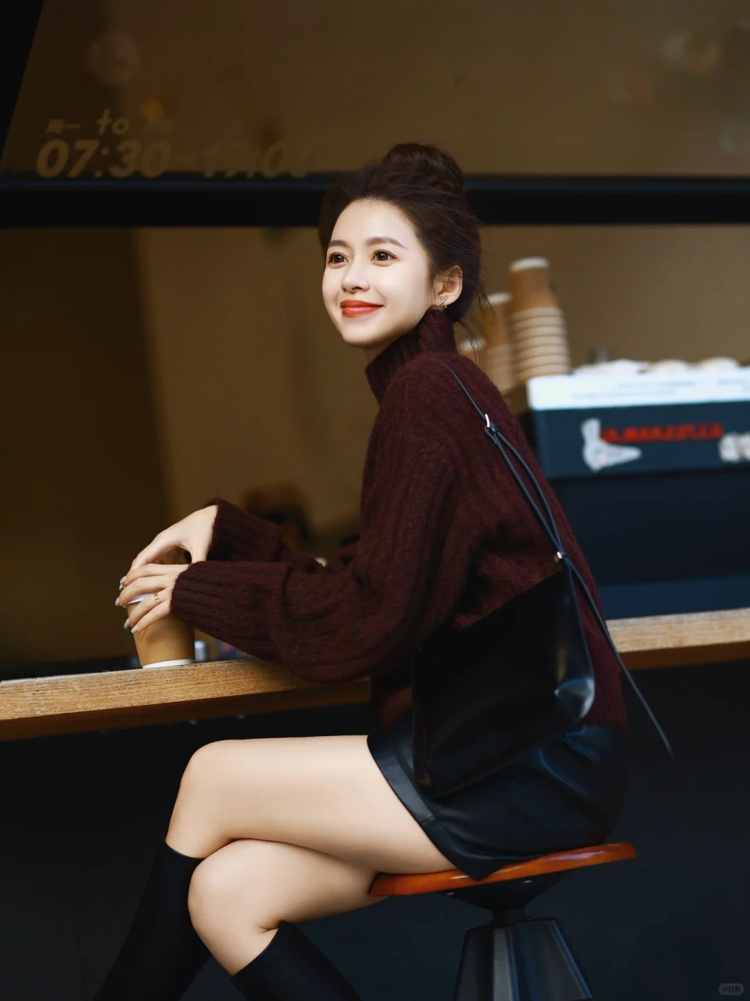 毛衣绝对是每年入秋必备了 安克拉红配色真的超绝 搭配黑色皮裤和长靴 呈现自在又些许时髦的早秋look 在温度些许微凉的时候安排上刚刚好 -