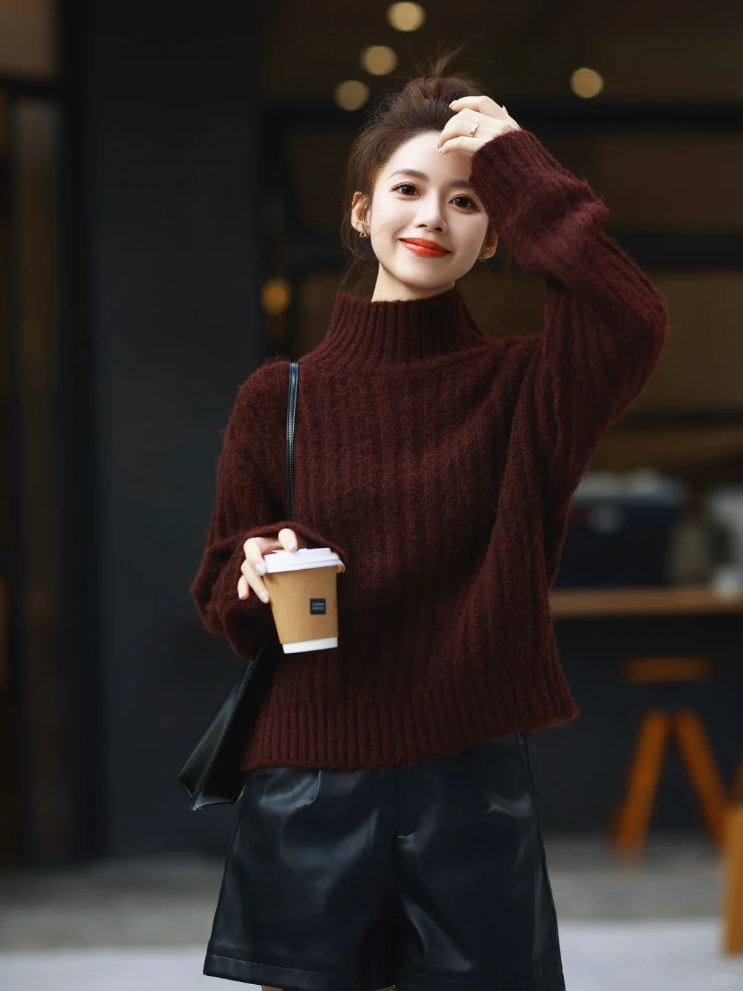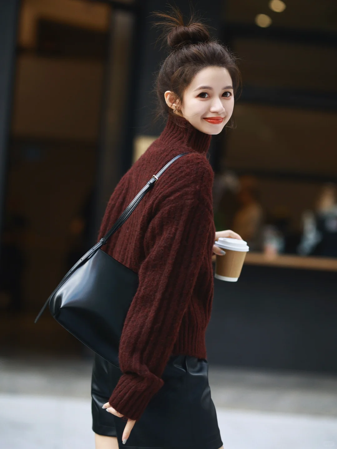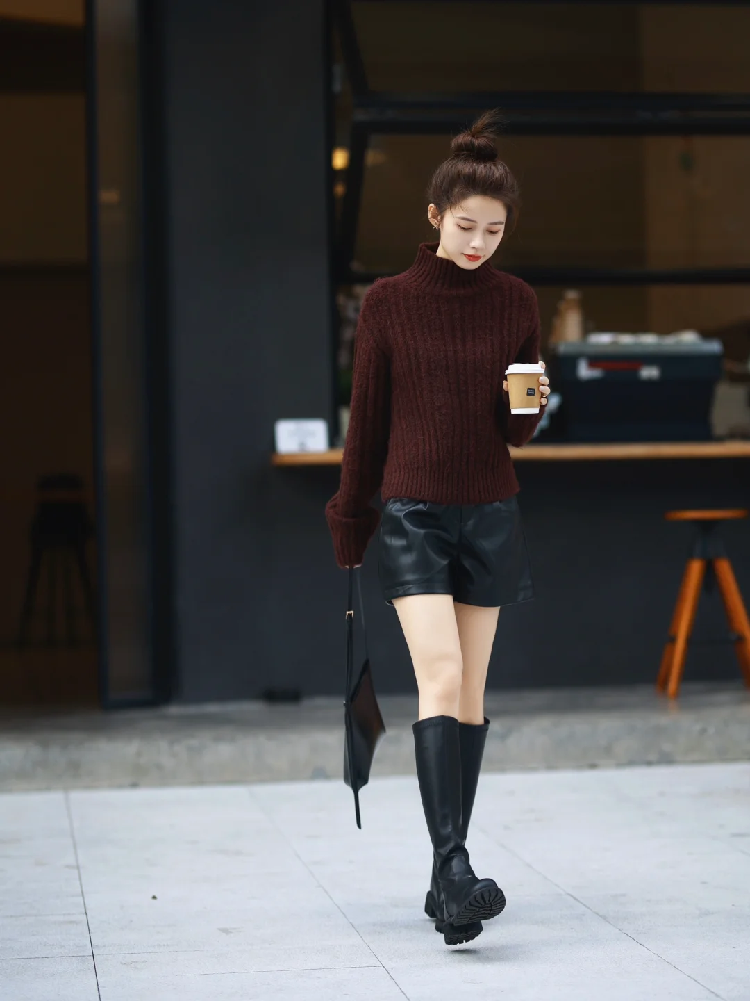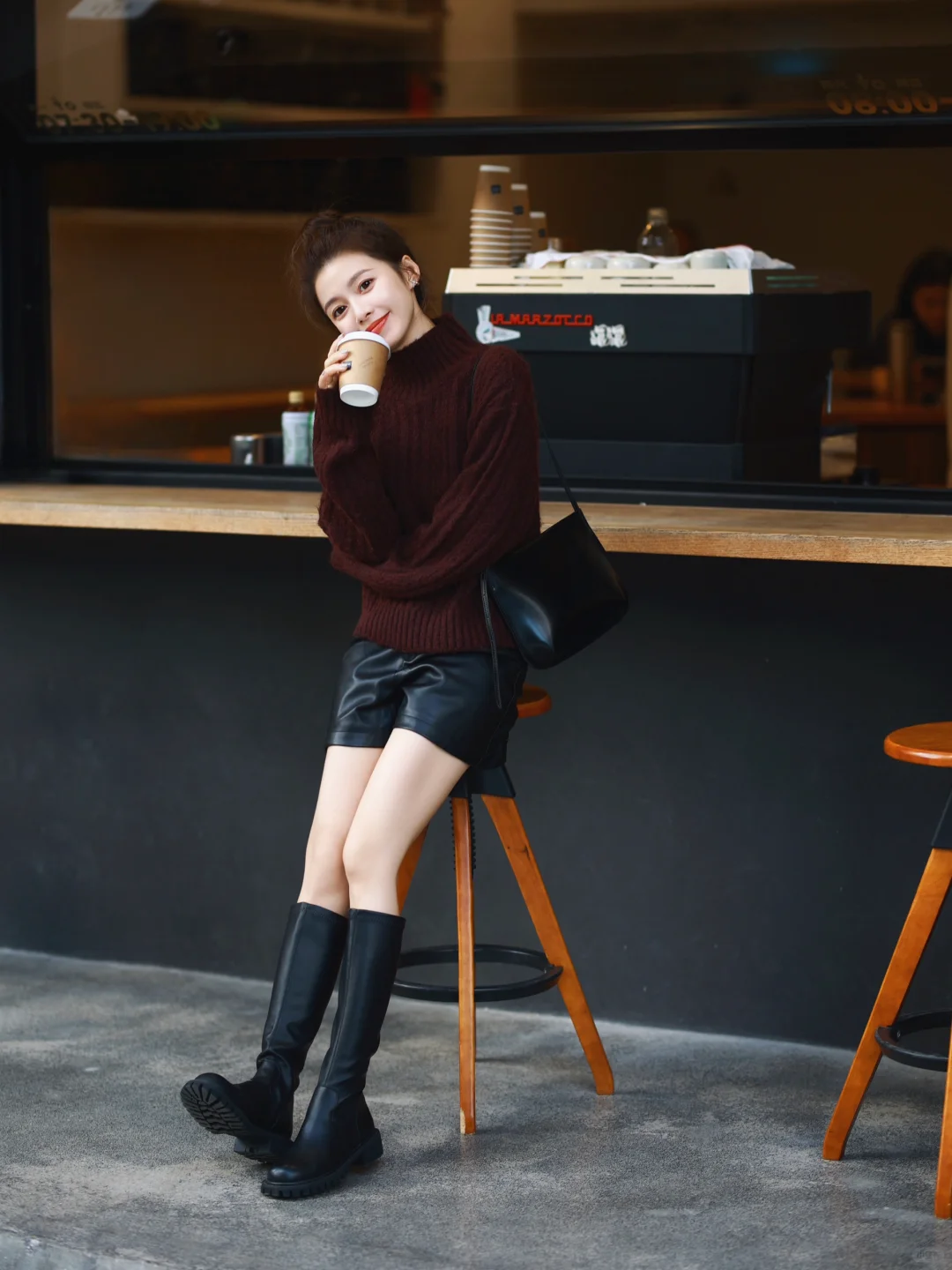 毛衣绝对是每年入秋必备了 安克拉红配色真的超绝 搭配黑色皮裤和长靴 呈现自在又些许时髦的早秋look 在温度些许微凉的时候安排上刚刚好 -