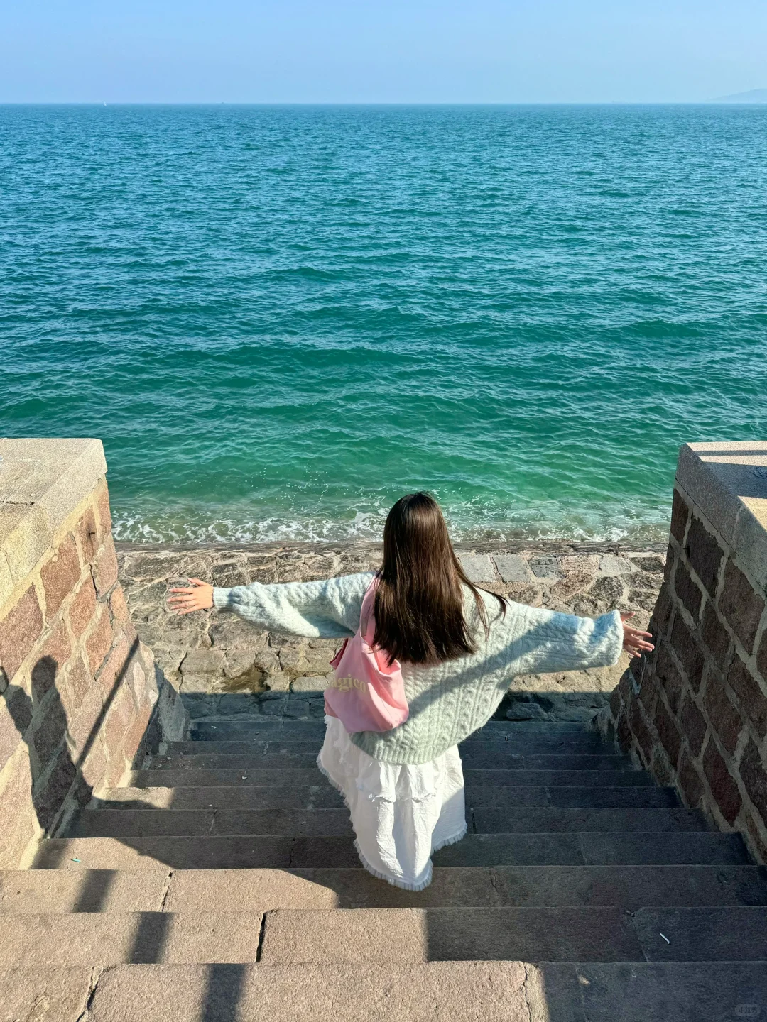 真的别直奔栈桥啦 人多还不好拍 栈桥右侧这条海岸线人少景美 ✨具体路线:青岛站(地铁站)——西陵峡路——李慰农公园(栈桥合影机位)——栈桥——天主教堂——大鲍岛 避开了栈桥人挤人 随便拍拍都好有氛围🌊 -