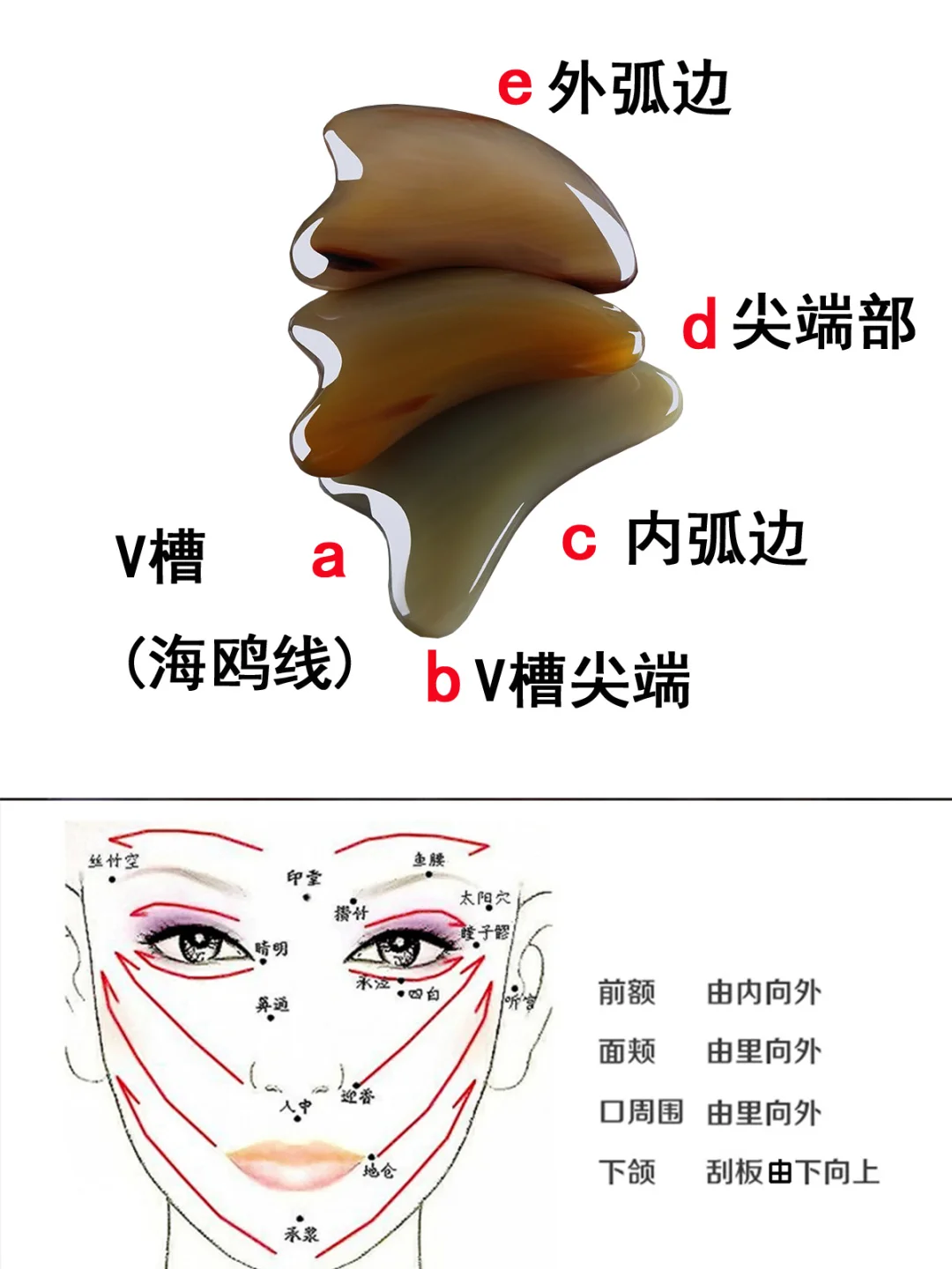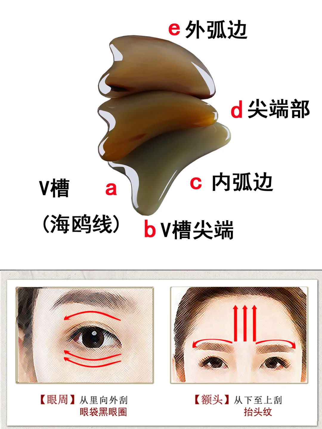 剖析刮痧板结构: a、V槽(海鸥线) b、V槽尖 端部位 c、内弧边 d、尖 端部位 e、内弧边 💡尖 端部位用于眼周、揉按穴位等; 💡外弧边用于面部、四肢、肩颈、背部等; 💡内弧边脸部、肩颈、四肢等; 💡V槽(海鸥线)用于下巴、手指、鼻部等; 💡V槽尖 端部用于法令纹、鱼尾纹部位 - 刮痧板面部使用步骤 1⃣~~~额部~~~ 路线:眉心➡️额头中线➡️美人尖; 路线:眉心➡️额角➡️太阳穴。 刮痧板d部位 . 2⃣~~~眼周~~~ 寸拨方式: 路线:上下眼眶,由内往外 刮痧板d和b部位 . 3⃣~~~鼻翼~~~ 画小圆圈 眉头➡️鼻梁侧边,由上往下轻刮至鼻翼 刮痧板d和a部位 . 4⃣~~~面颊~~~ 螺旋方式: 鼻翼侧➡️太阳穴下; 画圈的方式 嘴角往斜上➡️颧 骨下 使用刮痧板c部位 . 5⃣~~~下颌线~~~ 下巴➡️顺着颔骨上方➡️耳垂前方 使用刮痧板a部位 - 天然白水牛角,细腻亲肤,自然舒适感强,不起静电,角质蛋白有益于身体。 挑选小技巧: 弧度贴合肌肤,受力均匀,提拉按摩合适。 - 【实用单品分享】 爱心刮痧板:基础经典的板型,用于面部 拨筋棒:主要用于眼部,圆珠用来点穴拨筋,眼刮可以按摩提拉眼周,帮助眼霜导入,有效改善眼部干细纹、眼袋、黑眼圈。 包包梳:精致女生包中必备单品,常梳梳头发,放松,促进循环。 洗头梳:角筒料制作,圆润,可以清洁头皮,同时也可达到按摩的效果。 . 刮痧板,拨筋棒,梳子 天然材质,每个都不一样