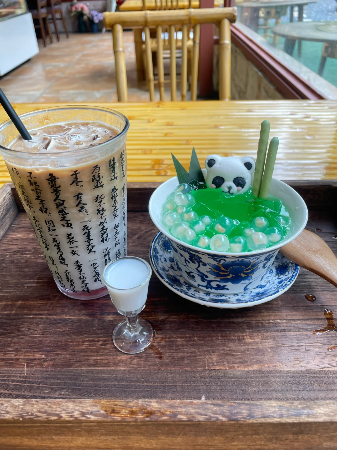 🍨说到美食,这里的熊猫冰粉简直萌化了我的心!熊猫形状的棉花糖是薄荷味的,搭配椰奶和马蹄啵啵,口感清爽又Q弹。🥤荔枝冰茶也是颜值爆表,淡淡的荔枝香,夏日里来一杯,简直不要太惬意!🍹