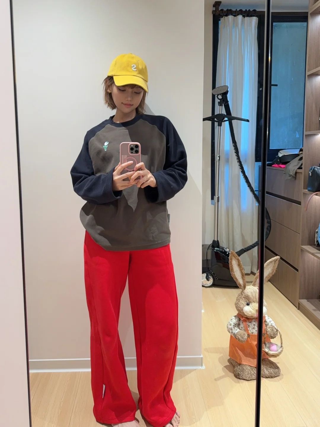 运动后放松时刻,穿红色卫衣,享受宁静时光。