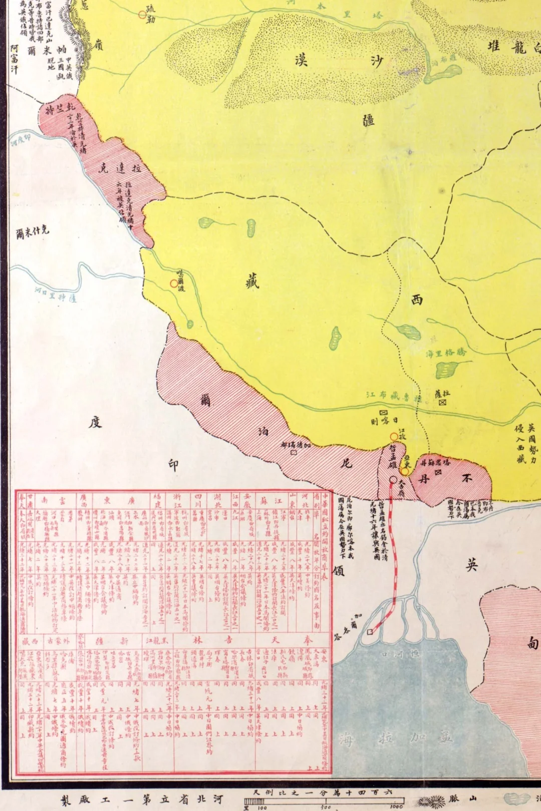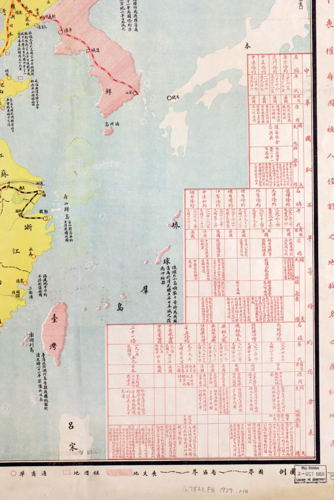 地图的右下角是“中华国耻不平等条约揭要表”,记录了1840年以来与清政府和民国政府与列强签订的不平等条约及其主要内容。