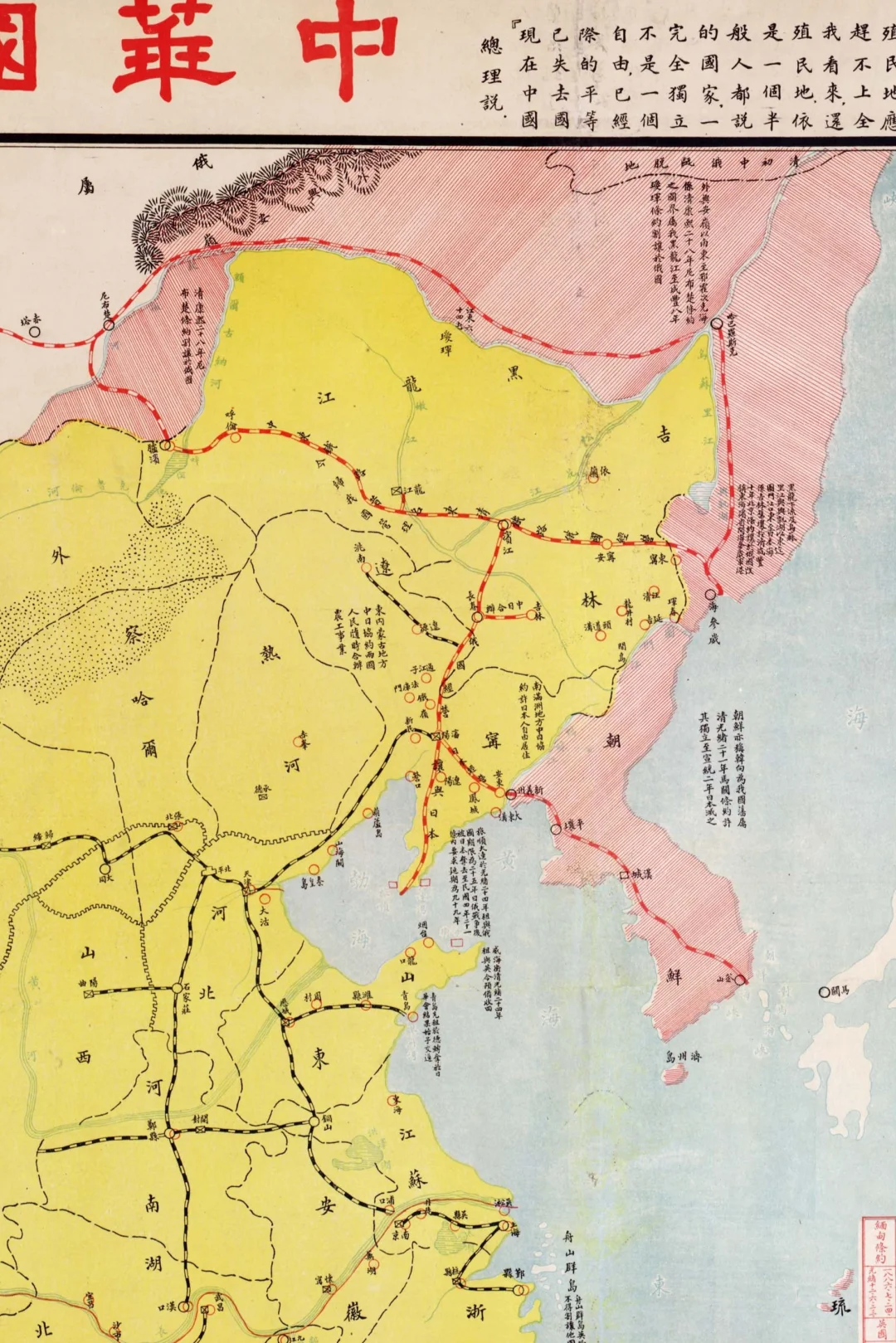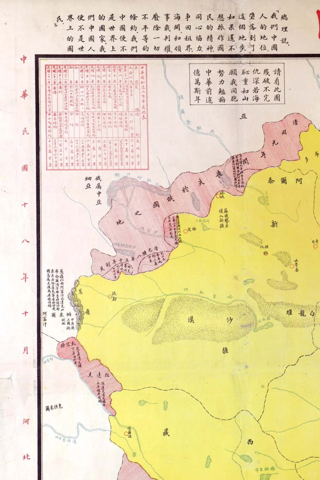 在地图标题“中华国耻地图”的两边,引用了孙总理的两句训言,还有“请看此图残破不完,仇深若海耻重如山,愿我同胞努力勉旃,中华前途亿万斯年”的警句。