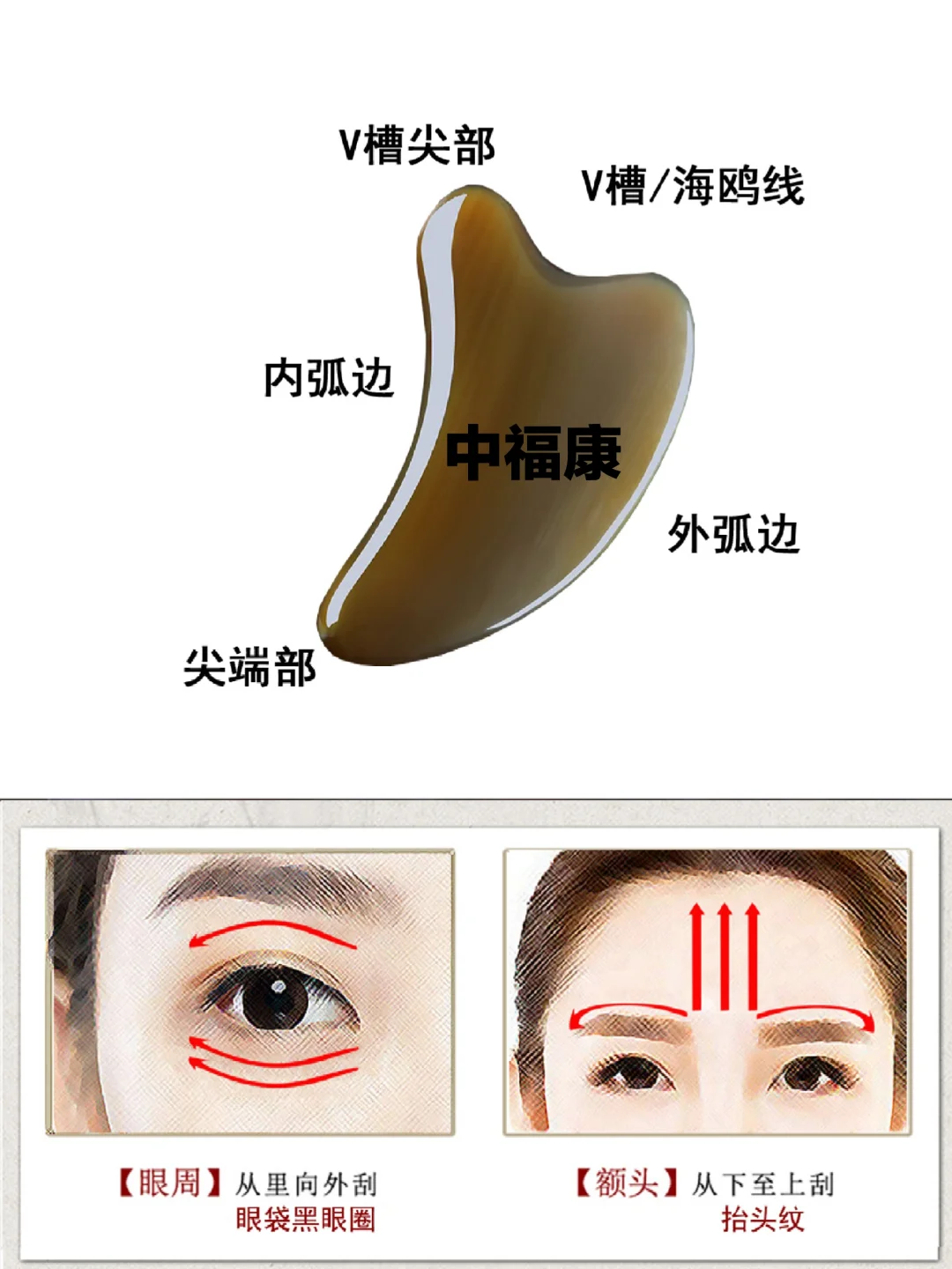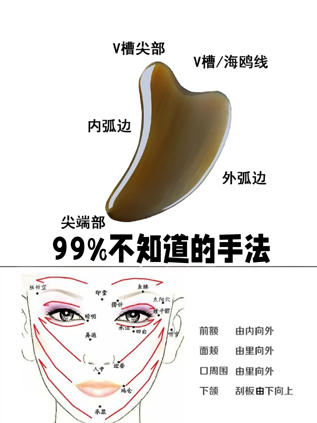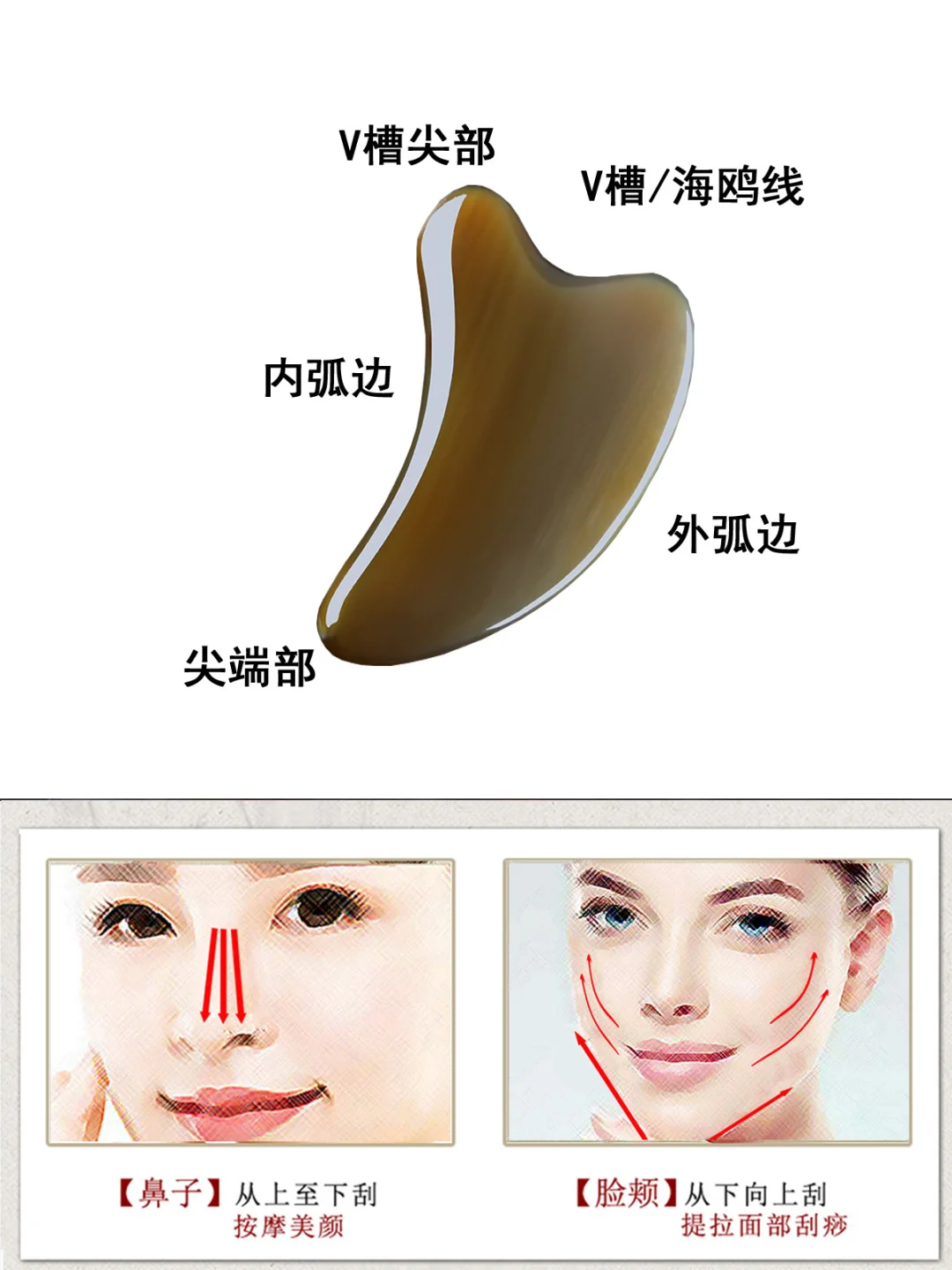 👉刮痧用具:刮痧精油(荷荷巴油、刮痧乳等)牛角刮痧板、牛角拨筋棒。 👉搭配护肤品:化妆水、精华乳、面霜、精华液、面膜、眼霜、防晒霜等等,效果+; 👉工具要求:整体光滑圆润,不伤肌肤,曲线设计,贴合肌肤,均匀受力 - 刮痧板使用顺序 🔴①、~~~额部~~~ 从眉心➡额前发际,由下➡上,再由正中到两边发际。 刮板外弧边 . 🔴②、~~~鼻部~~~ 从眉心中➡鼻尖,由上➡下。 用V槽部位 . 🔴③、~~~眼部~~~ 上下均由目内眦➡目外眦方向。 刮板尖 端部位 . 🔴④、~~~鼻翼~~~ 由鼻翼➡两侧太阳穴 用内弧边/外弧边 . 🔴⑤、~~~嘴部~~~ 由嘴角两边➡耳部正中。 刮板内弧边 . 🔴⑥、~~~下巴~~~ 由下巴➡耳后凹陷处(翳风穴)。 下颌线用刮痧板V槽/内弧边 . 🔴⑦、~~~穴位点按揉~~~ 刮痧板尖 端部位 - 日常保养白水牛角注意事项: 1️⃣不要暴晒晒太阳,避免热源(如靠近暖气片) 2️⃣不放湿度高的地方(如洗手间) 3️⃣避免硬物刮擦、防止刮伤 4️⃣阴凉干燥处存放 5️⃣不用腐蚀性溶剂洗涤,如含酸、碱、酒精等洗涤剂; - ⭕刮痧板、拨筋棒、梳子 ⭕天然产品,任何2个都不一样