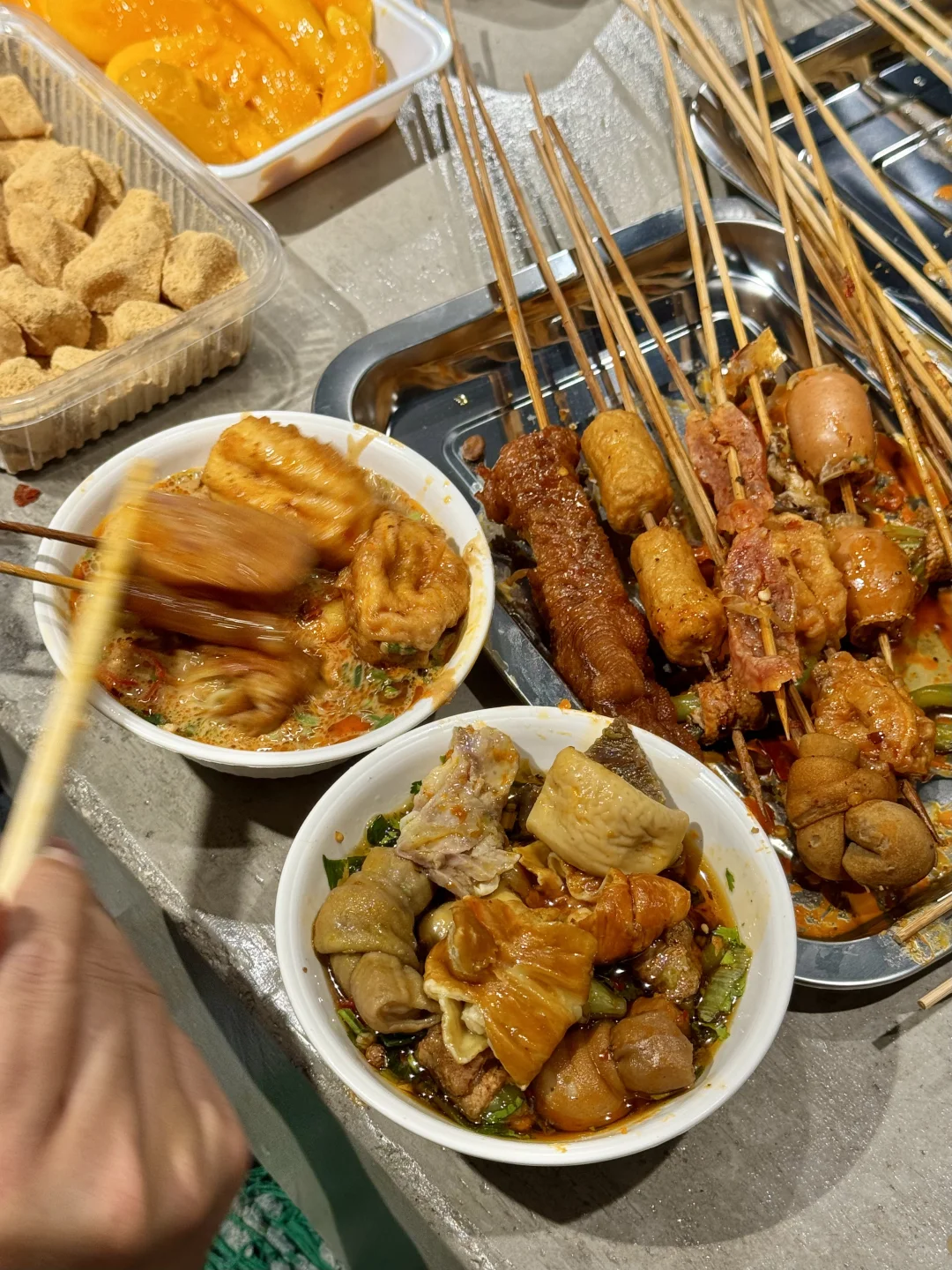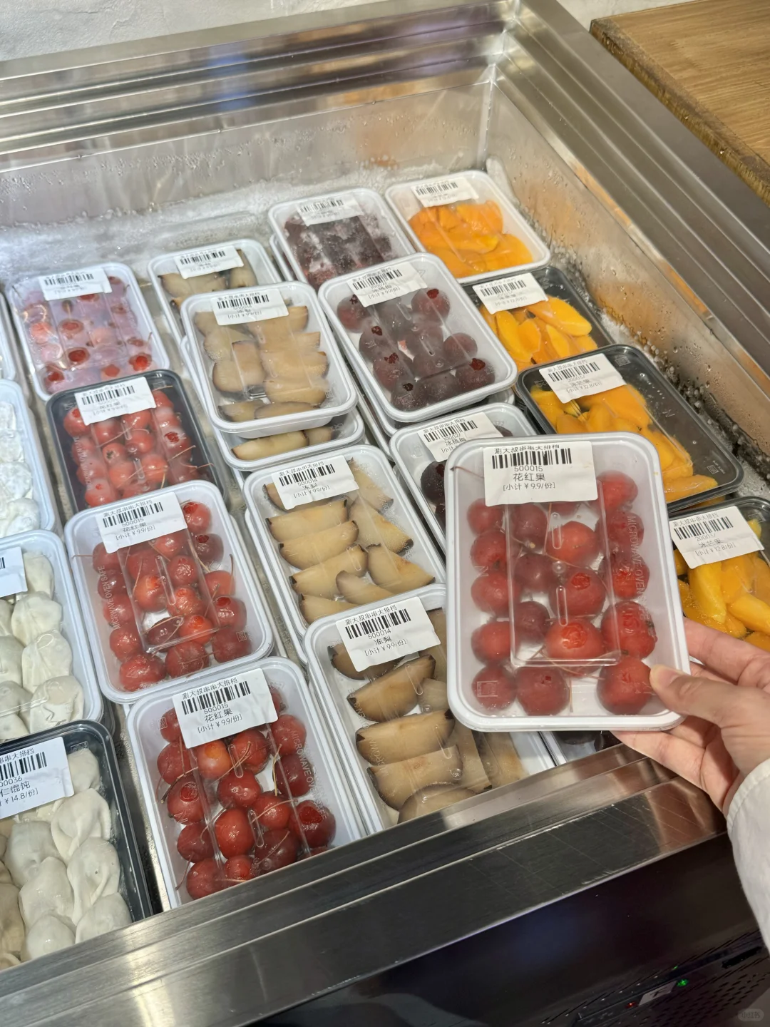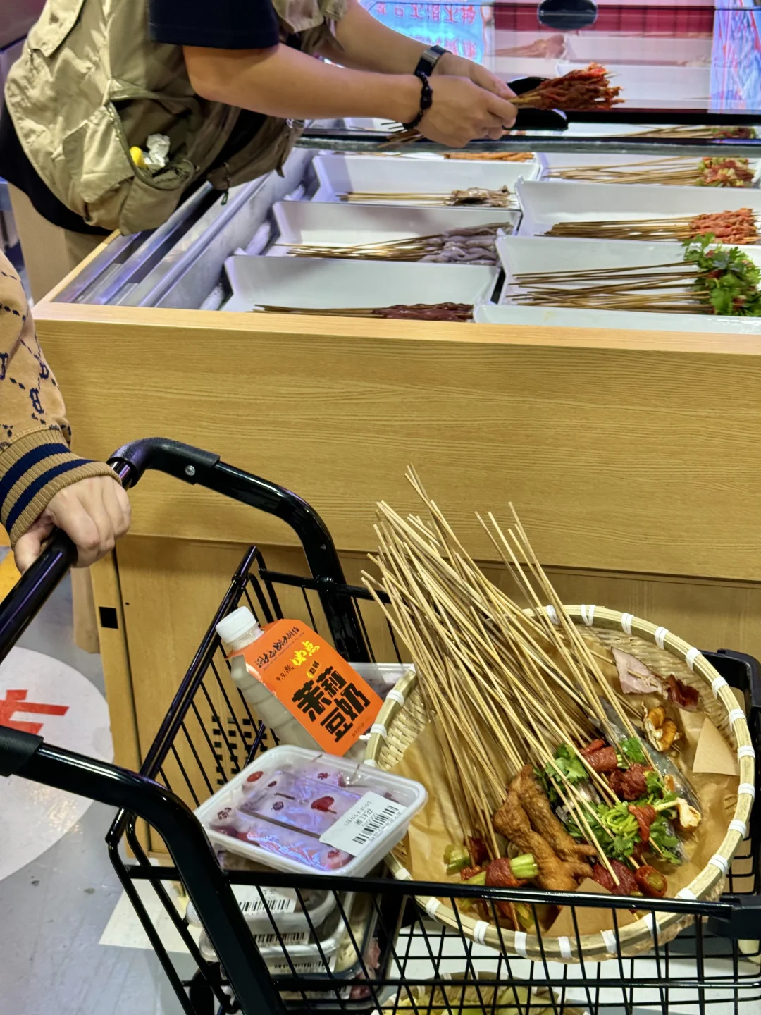 之前就羡慕东北涮冷面 青岛终于也有了 加点醋和麻酱好好吃🤤 来这儿就像在逛东北超市 看好啥就放推车里 串串儿也才0.9一根… 还有各种东北冻水果 零食也有一整柜 真给我逛爽了 -